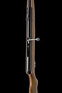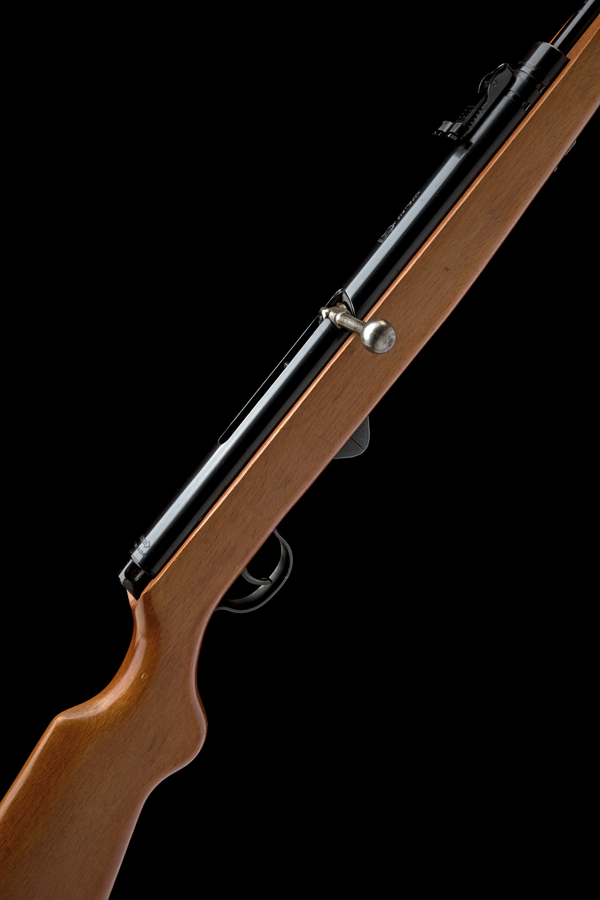 former East German production circa 1979, with blued 16in. barrel, blade fore-sight with protector, elevating rear-sight, plain blued air-chamber marked with the model and trade-marks, large articulated brushed bright bolt-handle operating within a central slot, rear-mounted push-pull safe, pale beech half-stock and detachable die-cast magazine in underside of fore-end, collector's external condition