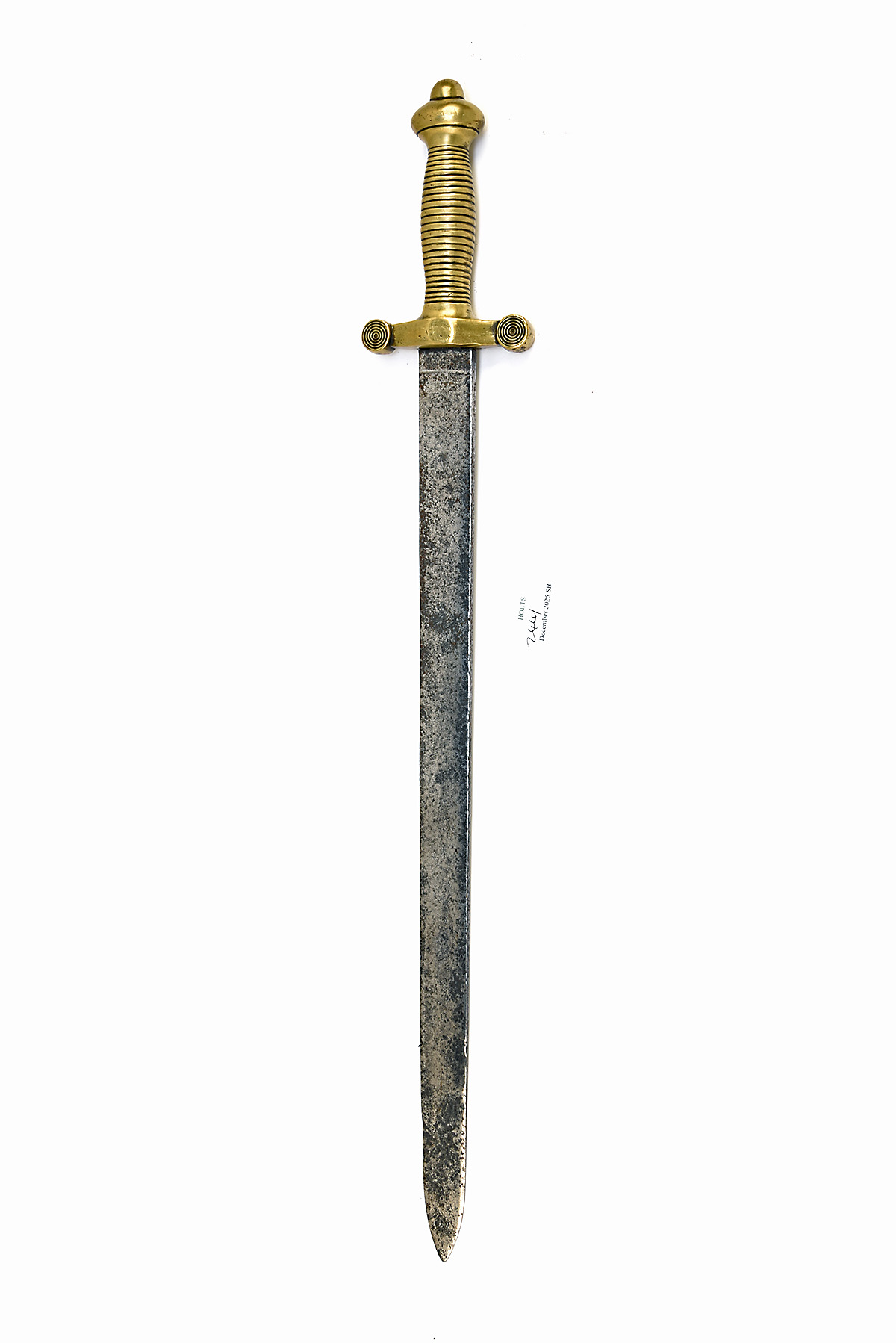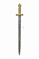 A PROBABLE PATTERN 1855 LAND TRANSPORT CORPS SWORD, possibly continental (Danish), circa late 1850s, with 21 3/4 in. straight unfullered single-edged blade, ribbed solid brass hilt, symmetrical round finials and oval pommel, scabbard absent, blade pitted