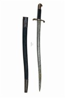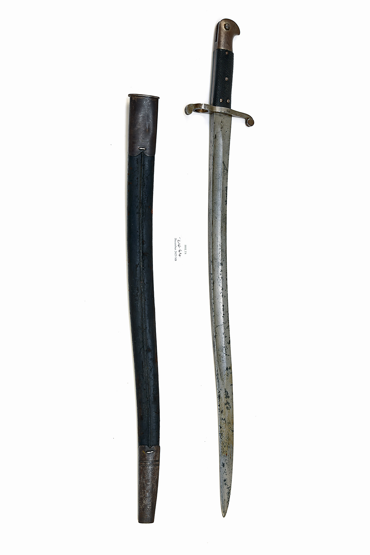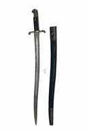 A SCARCE PATTERN 1863 YATAGHAN SWORD BAYONET FOR THE WHITWORTH RIFLE, circa 1864, with 22 3/4 in. single-edged blade fullered on each side, ricasso with crown above 'V. R', with Enfield inspection mark over, further inspection mark and 'H' on blade back, steel cross-guard, black pressed leather chequered grips, further inspection mark to hilt back, bird's head pommel with circular mortise, with it's black leather scabbard with steel fittings, some staining to blade, scabbard grazed, back of locket with shallow denting