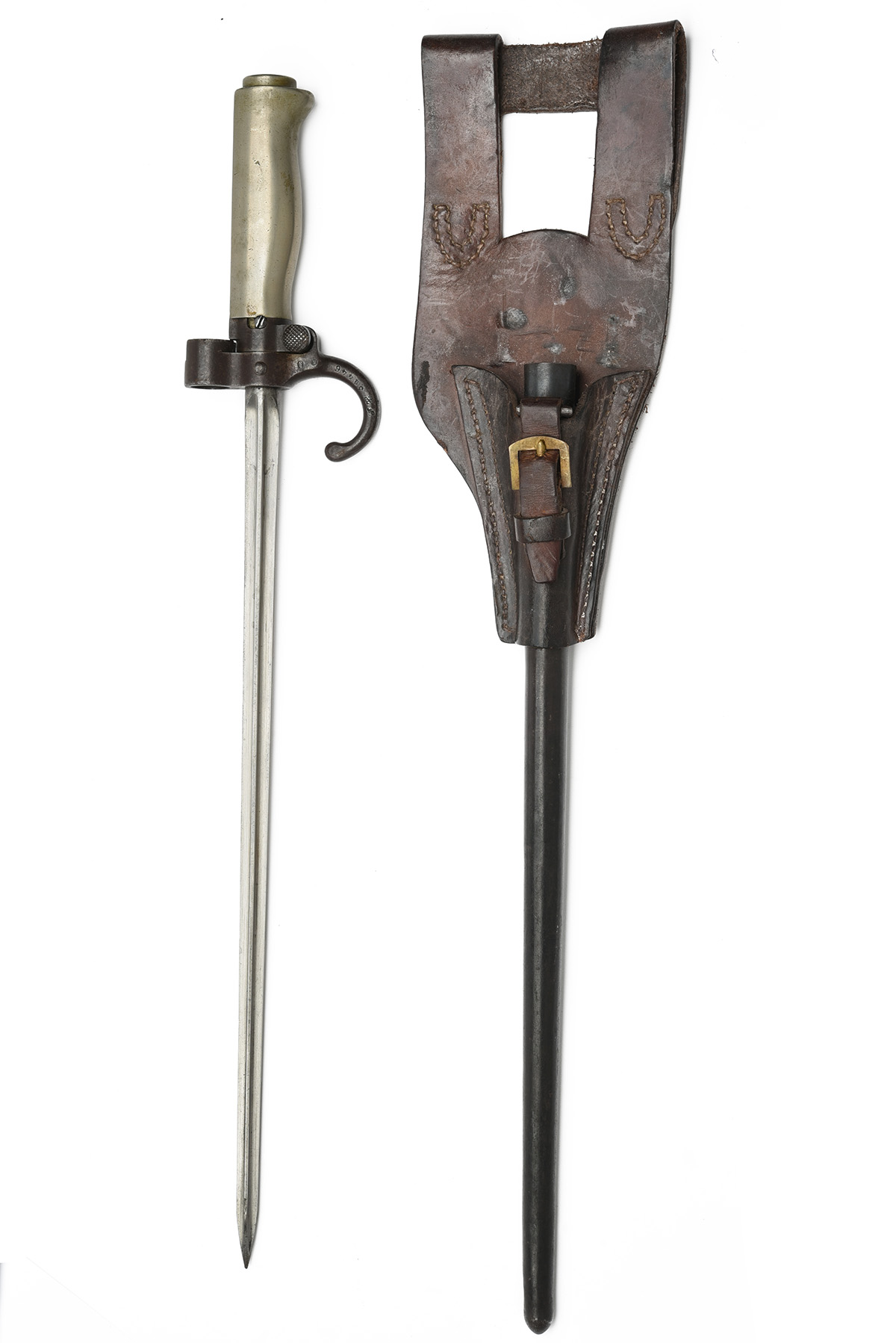 A FRENCH WORLD WAR I MODEL 1886/15 BAYONET FOR THE LEBEL RIFLE, with 13 1/2 in. cruciform blade, cross-guard retaining quillion, alloy hilt, with its black steel scabbard and frown leather frog