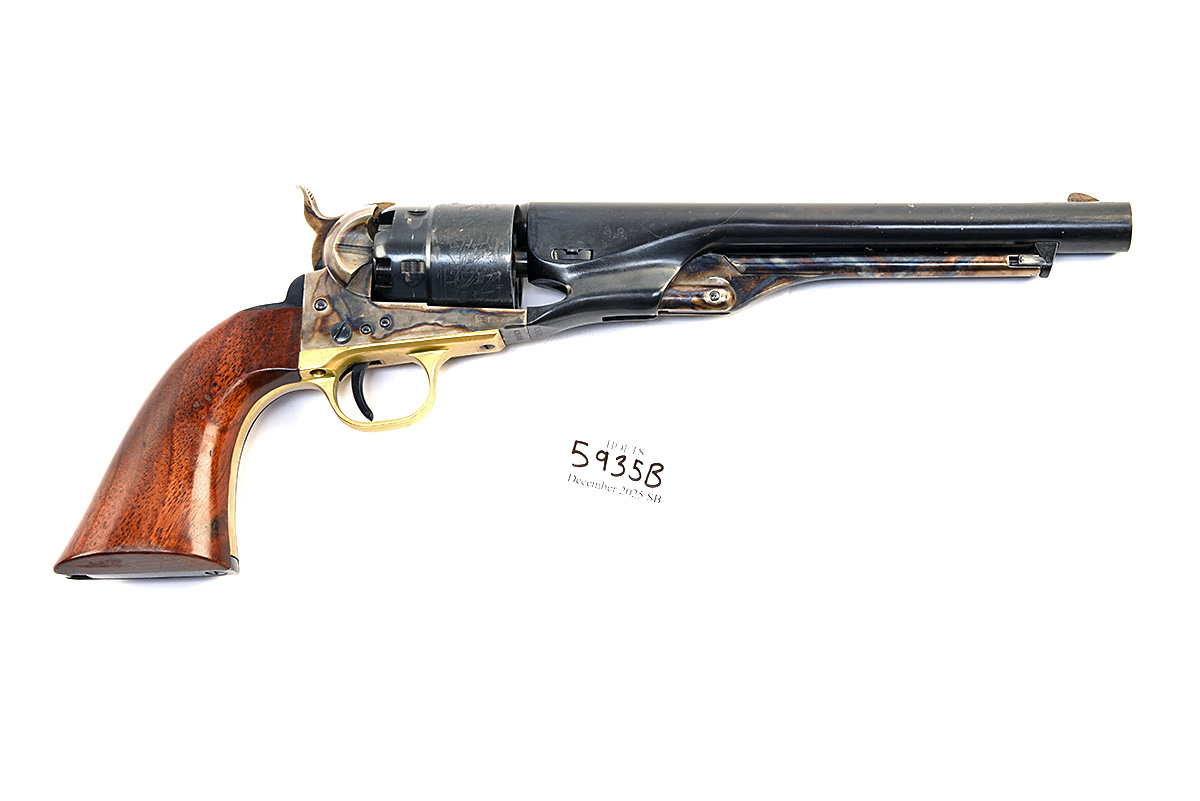 A BOXED REPRODUCTION .44 PERCUSSION 'UBERTI' REVOLVER '1860 COLT ARMY', USED IN THE FILMING OF COLD MOUNTAIN, serial no. A26980, with 8in. blued round barrel, colour hardened open frame, stepped engraved cylinder, brass trigger guard, smooth walnut grips in makers carton, together with letter of provenance from Zorg Limited (Film Armourers), dated April 2021 stating "Please accept this document as confirmation that this item, serial no. A26980, was one of the weapons shipped to Romania to be used in the filming of 'Cold Mountain', starring Jude Law and Nicole Kidman, although it is not possible to specify which particular actor used any specific weapon"