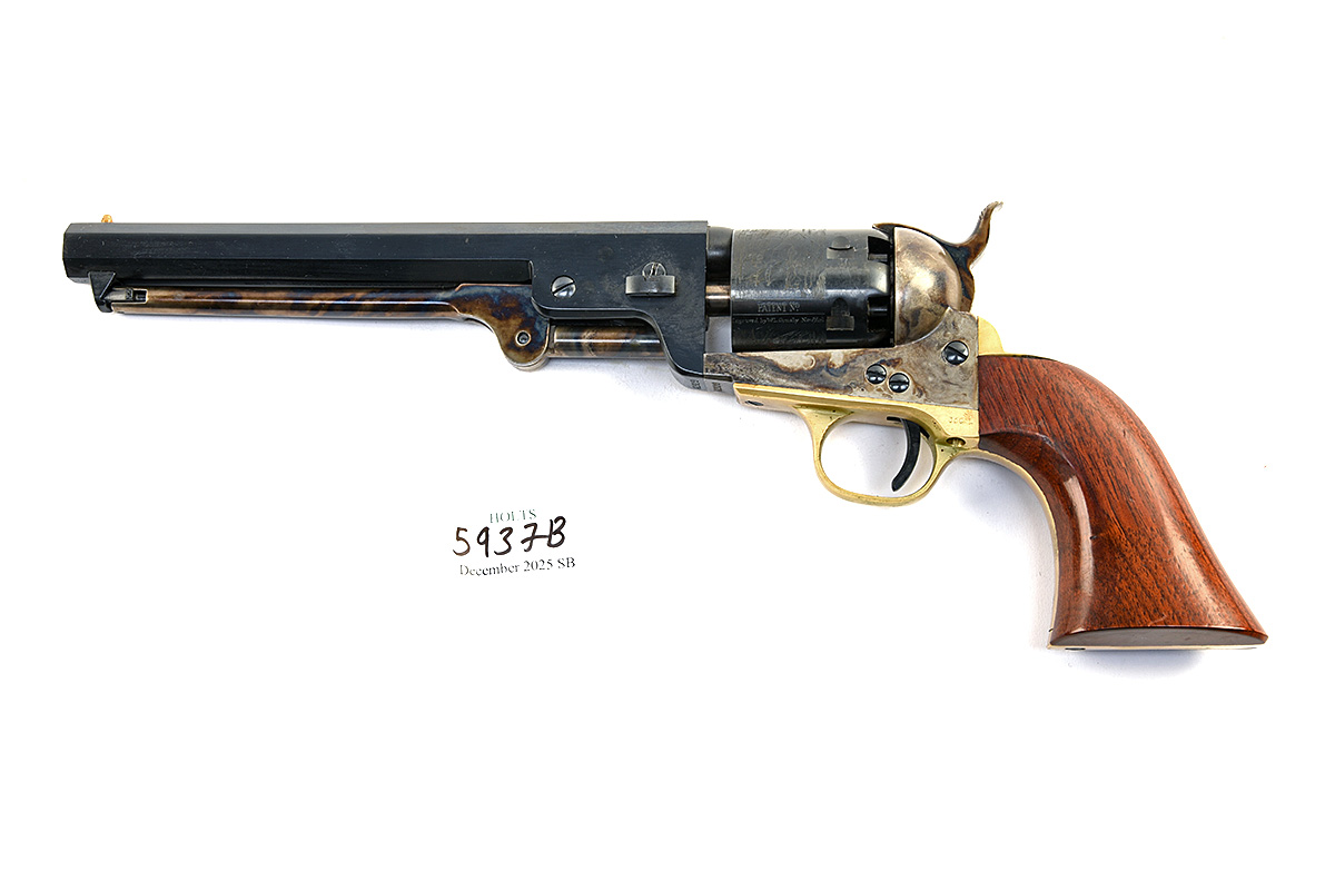 A BOXED REPRODUCTION .36 PERCUSSION UBERTI REVOLVER '1851 COLT NAVY', USED IN THE FILMING OF COLD MOUNTAIN, serial no. A29219, with 7 1/2in. blued octagonal barrel, colour hardened open frame and ram rod, blued engraved cylinder, brass trigger guard and grip-strap, smooth walnut grips in makers carton, together with letter of provenance from Zorg Limited (Film Armourers), dated April 2021 stating "Please accept this document as confirmation that this item, serial no. A29219, was one of the weapons shipped to Romania to be used in the filming of 'Cold Mountain', starring Jude Law and Nicole Kidman, although it is not possible to specify which particular actor used any specific weapon"