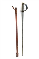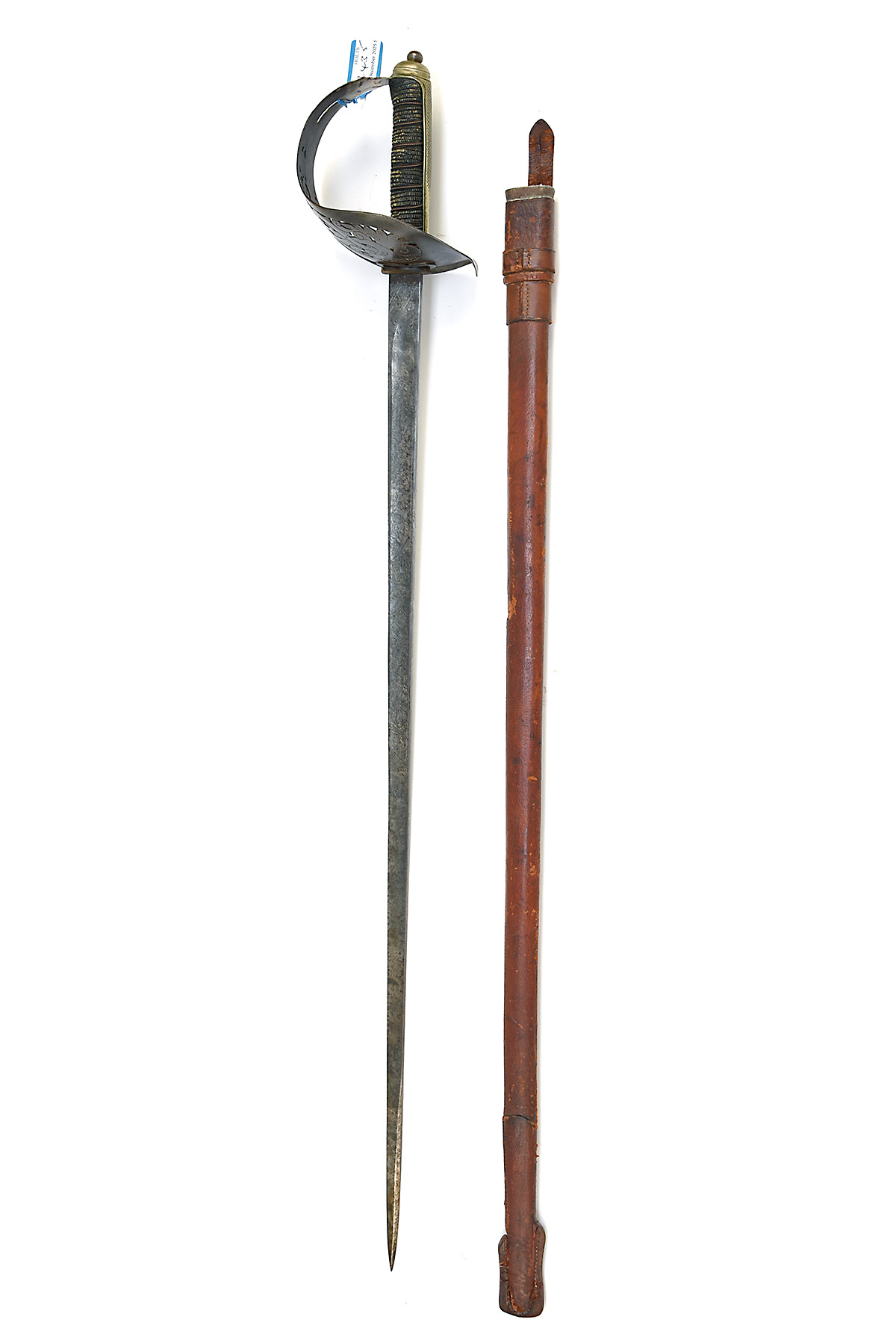 A WORLD WAR I GEORGE V PATTERN 1899 INFANTRY OFFICER'S SWORD, with 32 1/2 in. etched blade, ricasso with stamped 'PROVED' mark and ' C. BOYTON / & / SON / CLERKENWELL / EC' over, pierced guard with royal cypher, wire-bound grip, with its brown leather field scabbard, worn, blade stained, guard stained with blinded pitting, fish-skin absent from grip, scabbard splitting