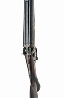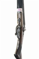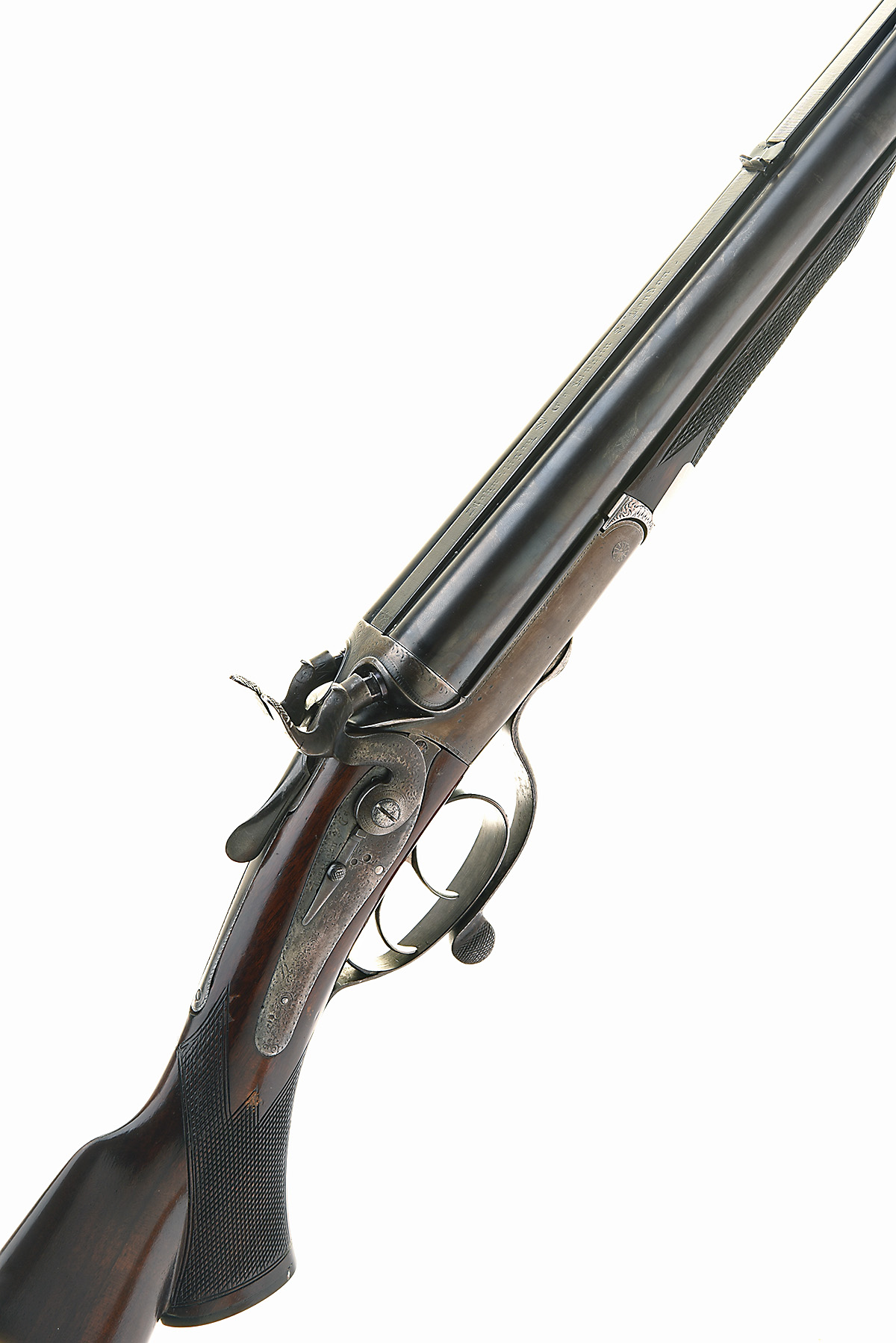 AN ANOMALOUS JOHN RIGBY & CO. .577/.500 (NO.2) BP EXPRESS TOPLEVER / ROTARY-UNDERLEVER DOUBLE-BARRELLED HAMMER RIFLE, serial no. '14188' / '999', circa 1879, 26in. Rigby trademarked black powder only barrels with file cut rib engraved on gothic script 'JOHN RIGBY & CO. DUBLIN & LONDON', with open sights and folding leaf sight, missing extractor screw, loop rebrazed and some distortion to under rib, carved percussion fences, non-rebounding back-action locks with repaired ornate bolted dolphin hammers (right hammer fractured at previous repair to spur), action flats with Rigby trademark, original 5 digit serial number defaced and new number '999' stamped (also to barrels and fore-end iron), Jones patent screw-grip patent rotary underlever and secondary diminutive toplever (operating a third sliding bolt engaging with rear lump), requiring the underlever to be operated to approx. two thirds throw and then the toplever to release the final third of the underlever operation, action bar heavily polished with some later naive border engraving, engraving to lockplates, underlever and hammers worn, replacement triggerguard with number 14188 engraved with an amateur hand, fore-end with identified Rigby's Patent grip-catch release, the iron (with repairs) with original 5 digit serial number defaced and later '999' stamped, some repairs to wood,14 5/8in. replacement pistolgrip stock with pistolgrip-cap, sling swivels and 3/8in. recoil pad, weight 9lb. 2oz.