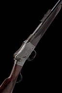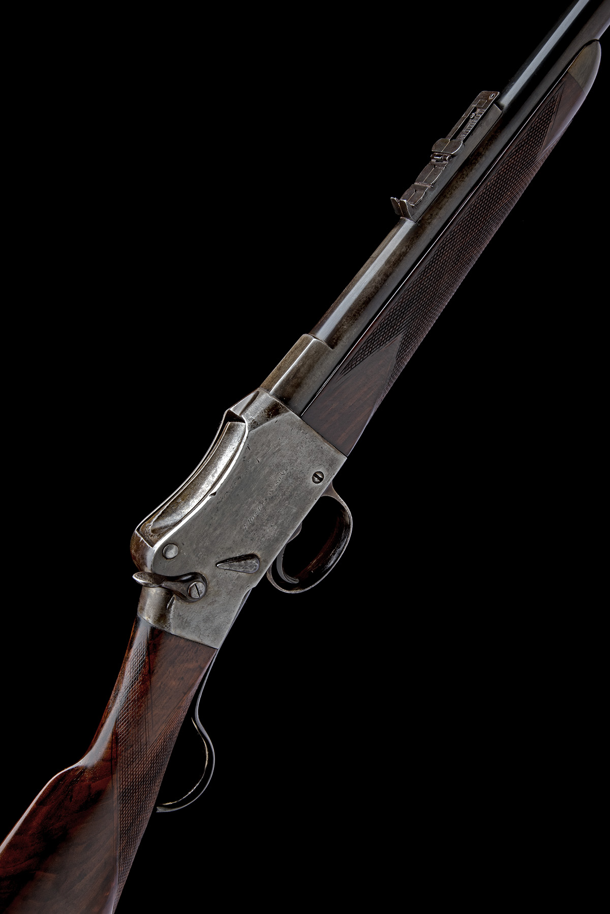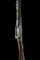 circa 1890, with blued round 26in. barrel, block and blade fore-sight, folding ladder rear-sight with two further folding leaves, traces of signature to nocksform, plain slab-sided receiver marked on the left side 'I. HOLLIS & SONS', thumb-safe and cocking indicator to the right hand side, chequered figured walnut butt-stock with iron heel-plate with central trap, plain finger-lever and chequered walnut splinter fore-end with horn tip, fitted with eyelets for a sling