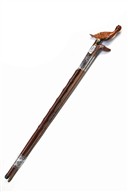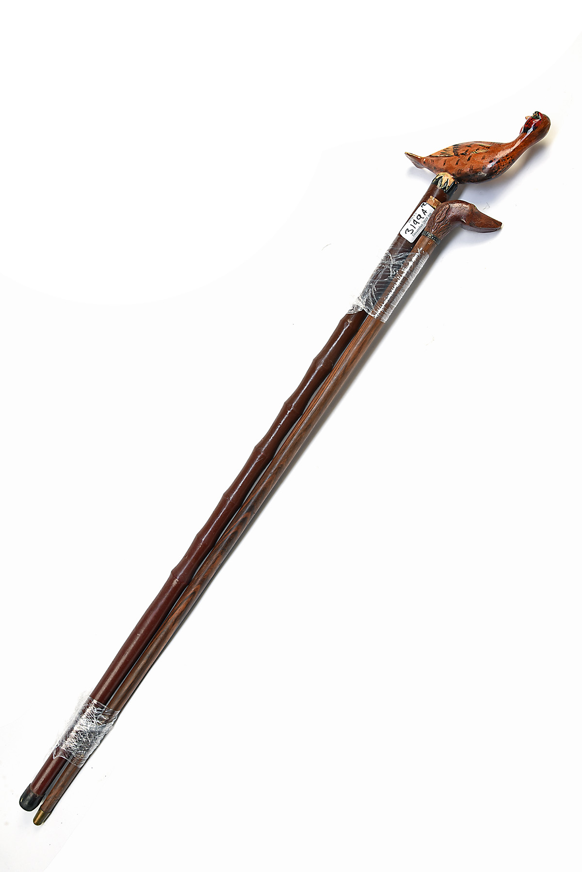 TWO WOOD WALKING STICKS, a 'B. OVER' with carved handle of a hunting dog approx. 36in. length, unsigned with carved pheasant handle approx. 40in. length (2)