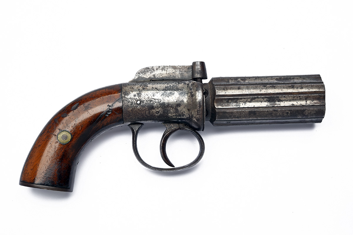 A 100-BORE PERCUSSION PEPPERBOX REVOLVER, UNSIGNED, no visible serial number,