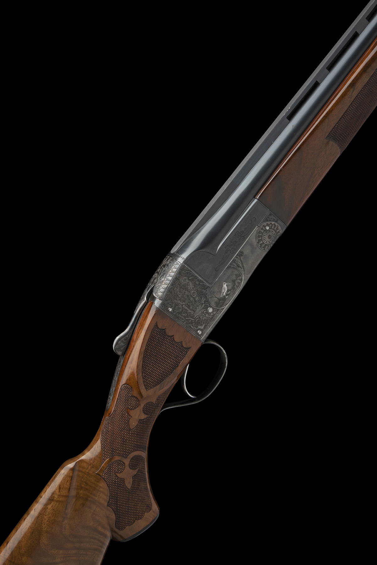for 1928, 32in. nitro reproved barrel (in 2006) with 11mm raised, ventilated matt-top rib with ivorine bead foresight and intermediate bead sight, 2 3/4in. chamber, bored approx. full choke, hold-open toplever, no safety catch, action serial numbered 401637, toplever return stud, the whole engraved with stylised floral and foliate motifs, surrounding vignettes of silver-inlaid pheasant and snipe, the underside with an eagle design and 'MADE IN U.S.A.' and 'ITHACA GUN CO. ITHACA. N.Y.', the triggerguard tang serial numbered 401637T, retaining some original colour-hardening, 14 3/4in. highly-figured pistolgrip stock with chequered side panels and fleur-de-lys motifs, pistolgrip-cap and sunburst ventilated rubber recoil pad, beavertail fore-end, weight 8lb. 7oz., with a case