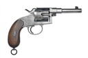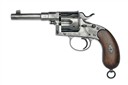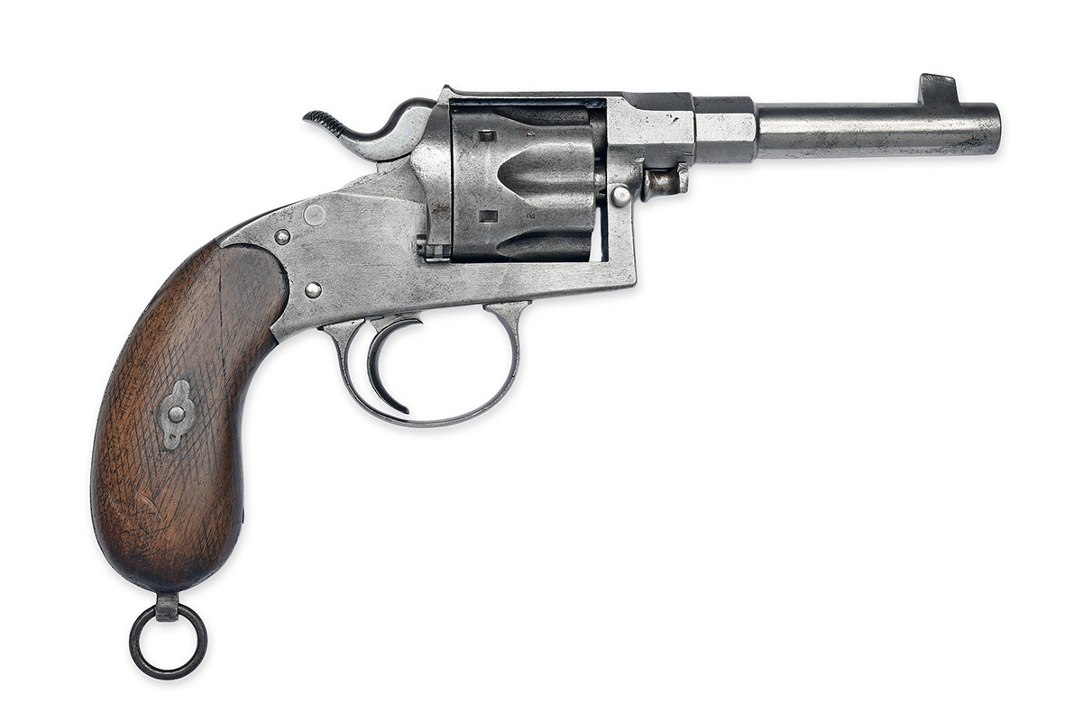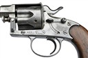circa 1887, with octagonal to round 4 5/8in. barrel, integral pinched blade fore-sight, sighting notch to rear of top-strap, solid frame, the left side below cylinder with an oval maker's stamp, 'church window' fluted six-shot cylinder, side safety, single action mechanism and walnut 'kidney-bean' grips with traces of chequering, the whole cleaned of finish, with certificate of proof