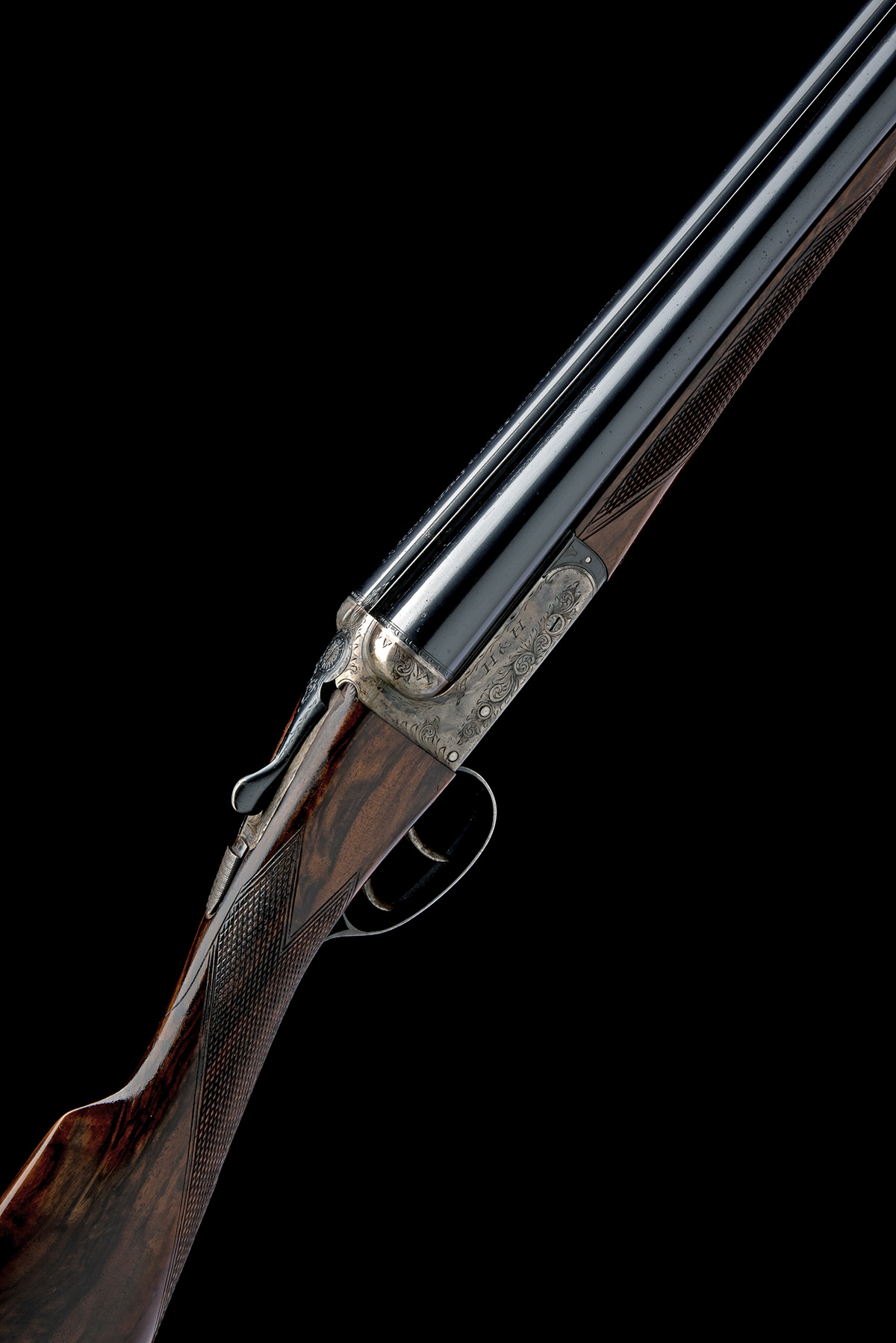 for 1971, 28in. nitro barrels, the tubes engraved 'SHOT & REGULATED BY HOLLAND & HOLLAND LTD. 13 BRUTON STREET. LONDON W.1.', 2 3/4in. chambers, bored approx. 1/4 and 3/4 choke, automatic safety with 'SAFE' detail, border and scroll engraving, the action signed 'H & H', retaining some original colour-hardening and finish, 15 1/4in. figured stock including buttplate, weight 6lb. 12oz., in a leather case with applied Holland & Holland trade label