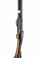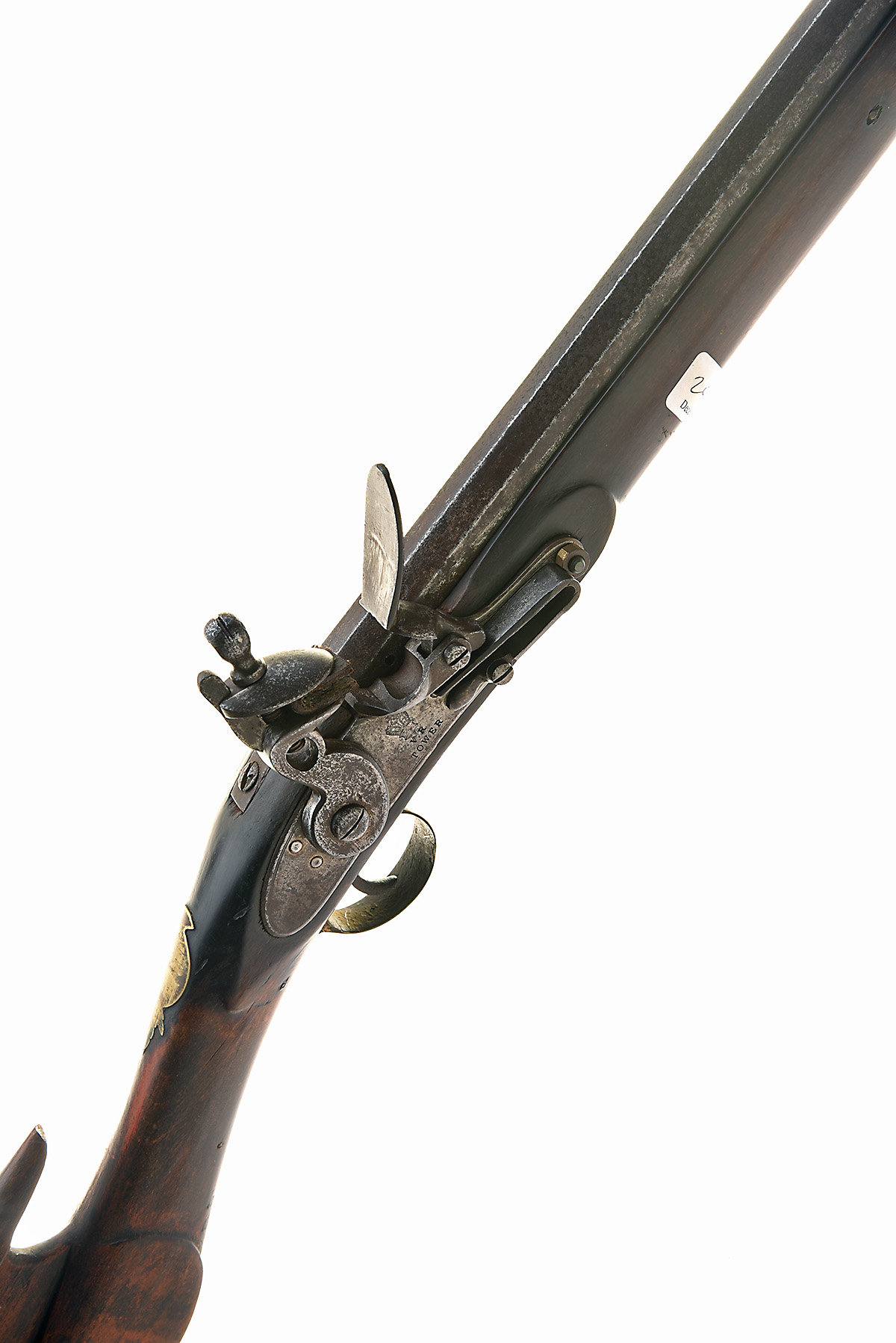 A RARE INDIAN COORG 18-BORE FLINTLOCK TRADE MUSKET SIGNED TOWER, no visible serial number, circa 1940s, with 51 in. round to octagonal sighted barrel with London proof-marks, border-engraved lock, full stock with distinctive Coorg styling, butt stamped 'BARNETT / MINORIES / LONDON', blank brass escutcheon at wrist, brass furniture, worn with rusting and pitting, rammer pipes chipped with losses, front pipe tied to barrel with string, 67 in. overall length