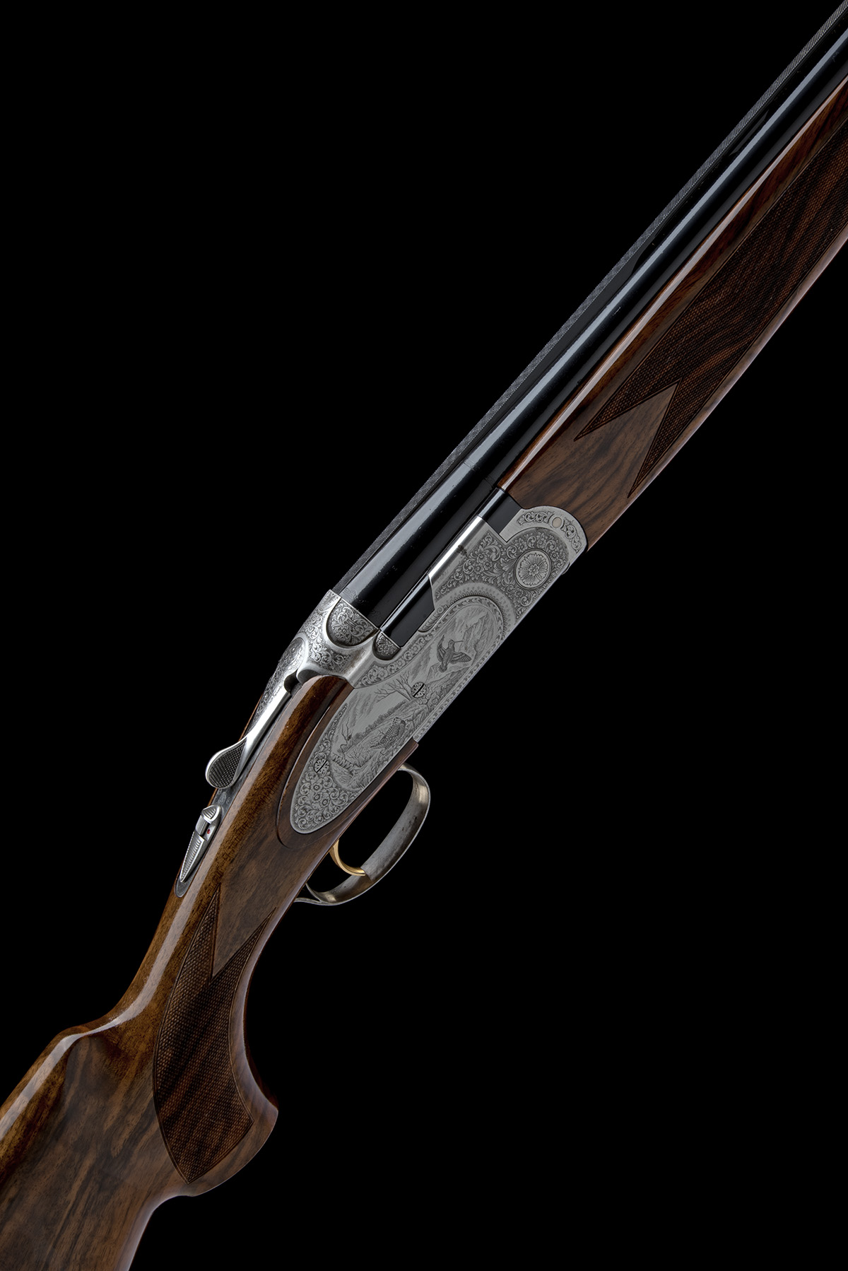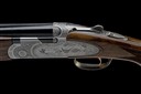 for 2003, 28in. nitro barrels with 6mm ventilated matt top-rib, 3in. chambers, bored approx. 1/4 and 1/2 choke, hold-open toplever, automatic safety with integral barrel selector switch, gold-washed trigger, floral scroll engraving surrounding game scenes of pheasant and woodcock, brushed finish, 14 1/2in. figured pistolgrip stock including wood buttplate, weight 7lb., in its universal case with outer carton