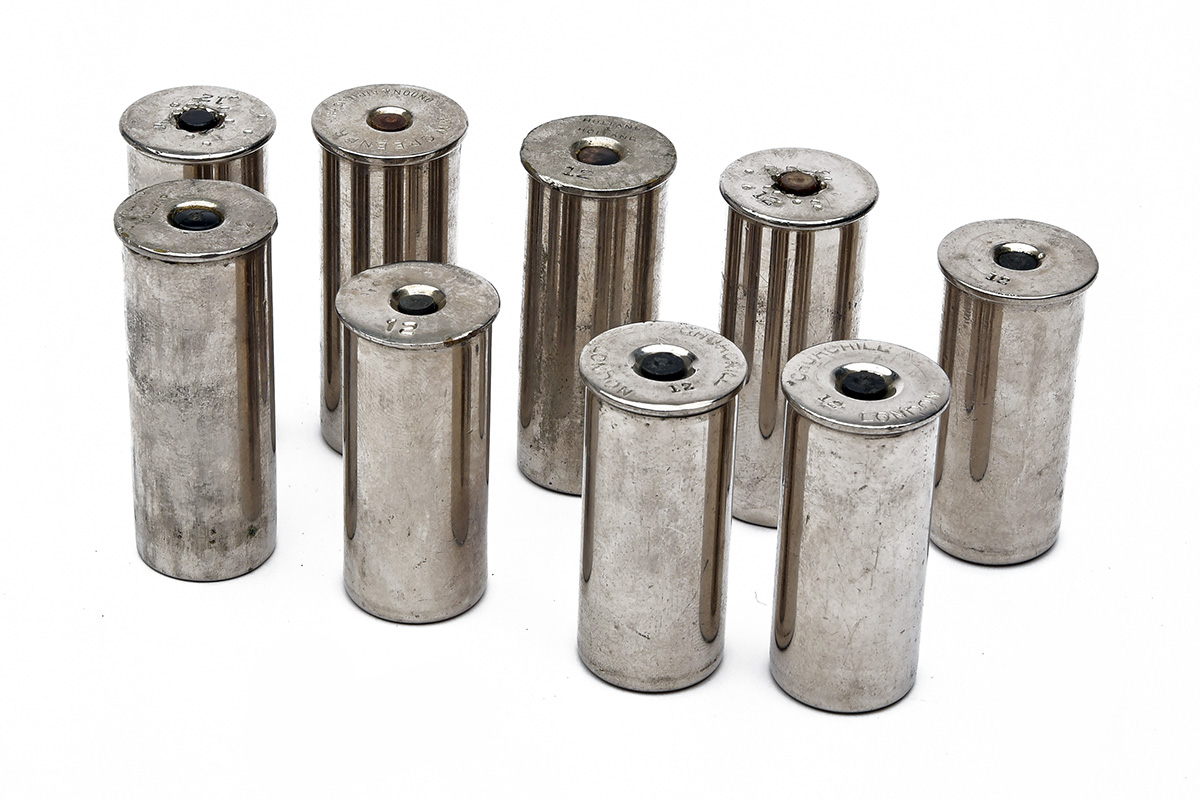 NINE VARIOUS 12-BORE NICKEL-PLATED SNAP CAPS, comprising of 2 'HOLLAND & HOLLAND', 2 'CHURCHILL' a 'W.W. GREENER' and 4 unsigned snap caps (9)