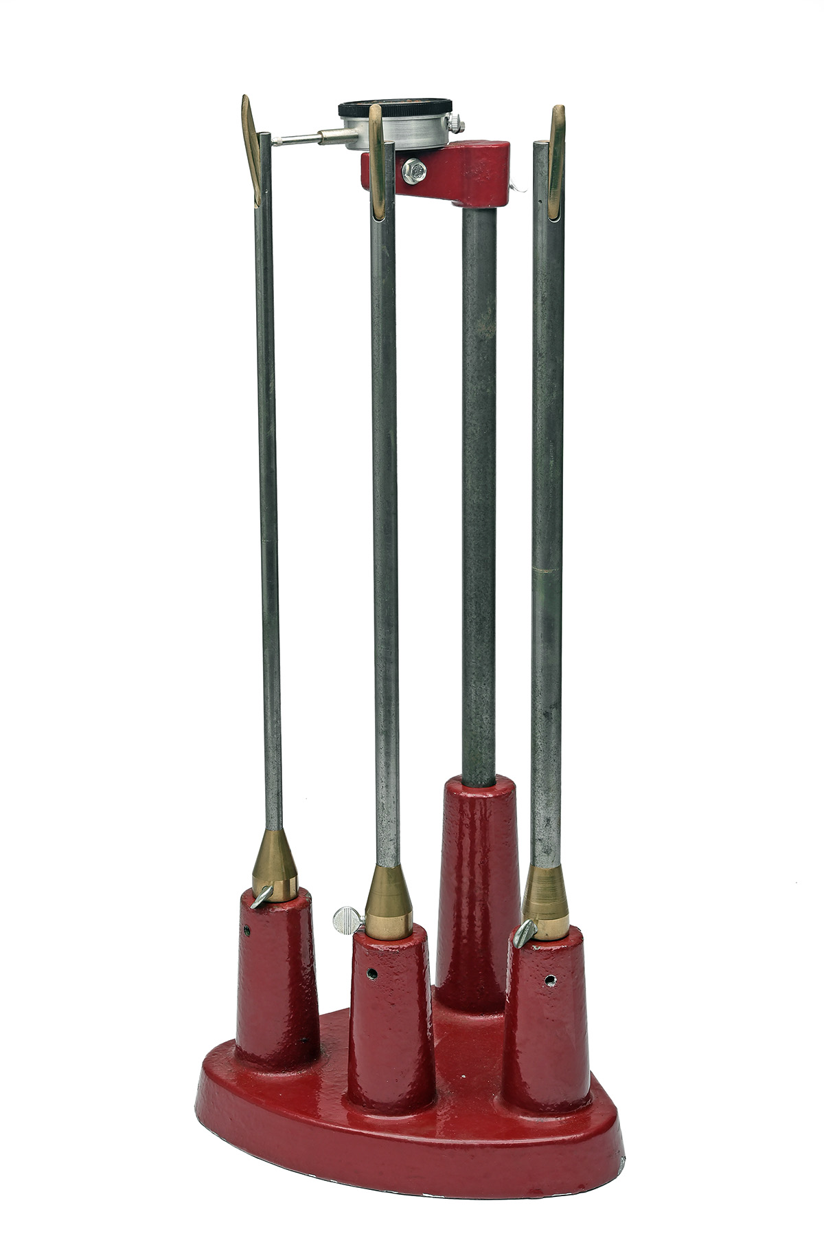 with red painted steel base, three upright prongs suitable for 12-bore, 16-bore and 20-bore, imperial LTL micrometer