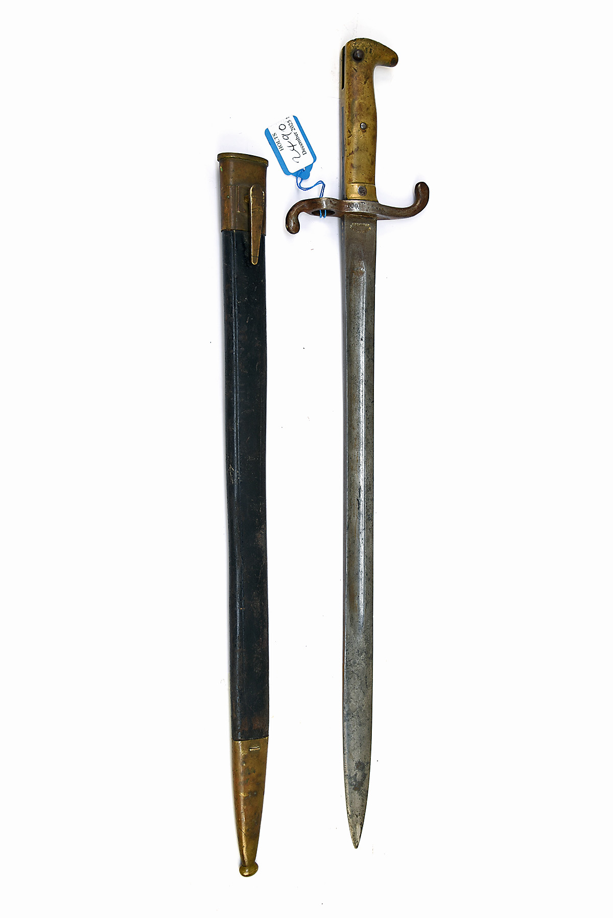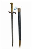 AN IMPERIAL GERMAN MODEL 1871 SWORD BAYONET, dated 1874, with 18 1/2 in. single-edged blade fullered on each side, ricasso marked 'ALEX COPPELL / SOLINGEN', blade back with inspection and ownership marks plus date '74', regimentally-marked quillioned cross-guard, brass hilt with inspection marks, together with its black leather scabbard with brass fittings, the locket with reissue regimental markings, inspection marks to locket, chape and leather, worn