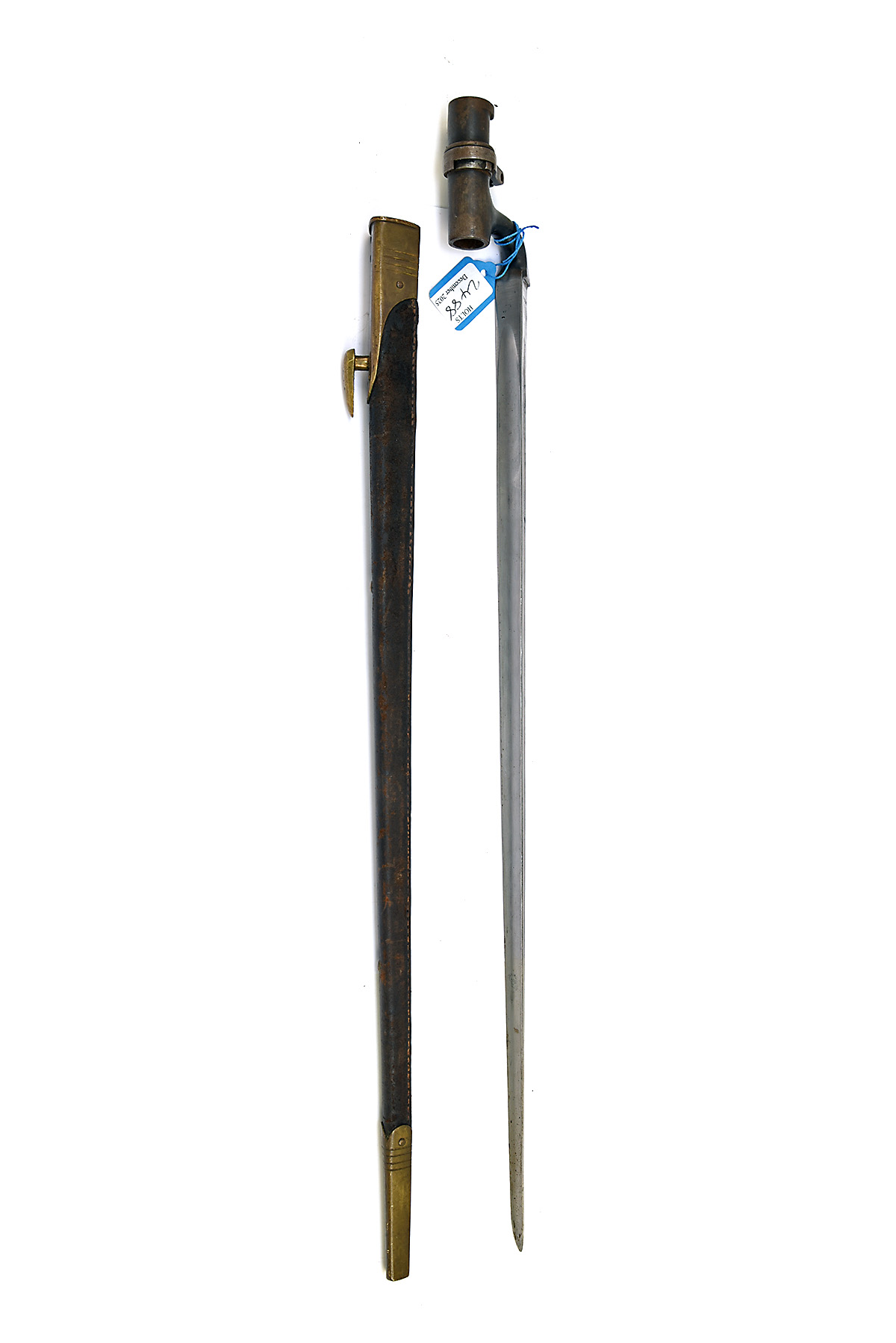 A PATTERN 1876 SOCKET BAYONET FOR THE MARTINI-HENRY RIFLE, circa early 1880s, with 21 1/2 in. triangular blade, ricasso with rubbed out British ownership markings, farsi serial number (Egyptian re-issue), black leather scabbard with brass fittings, worn
