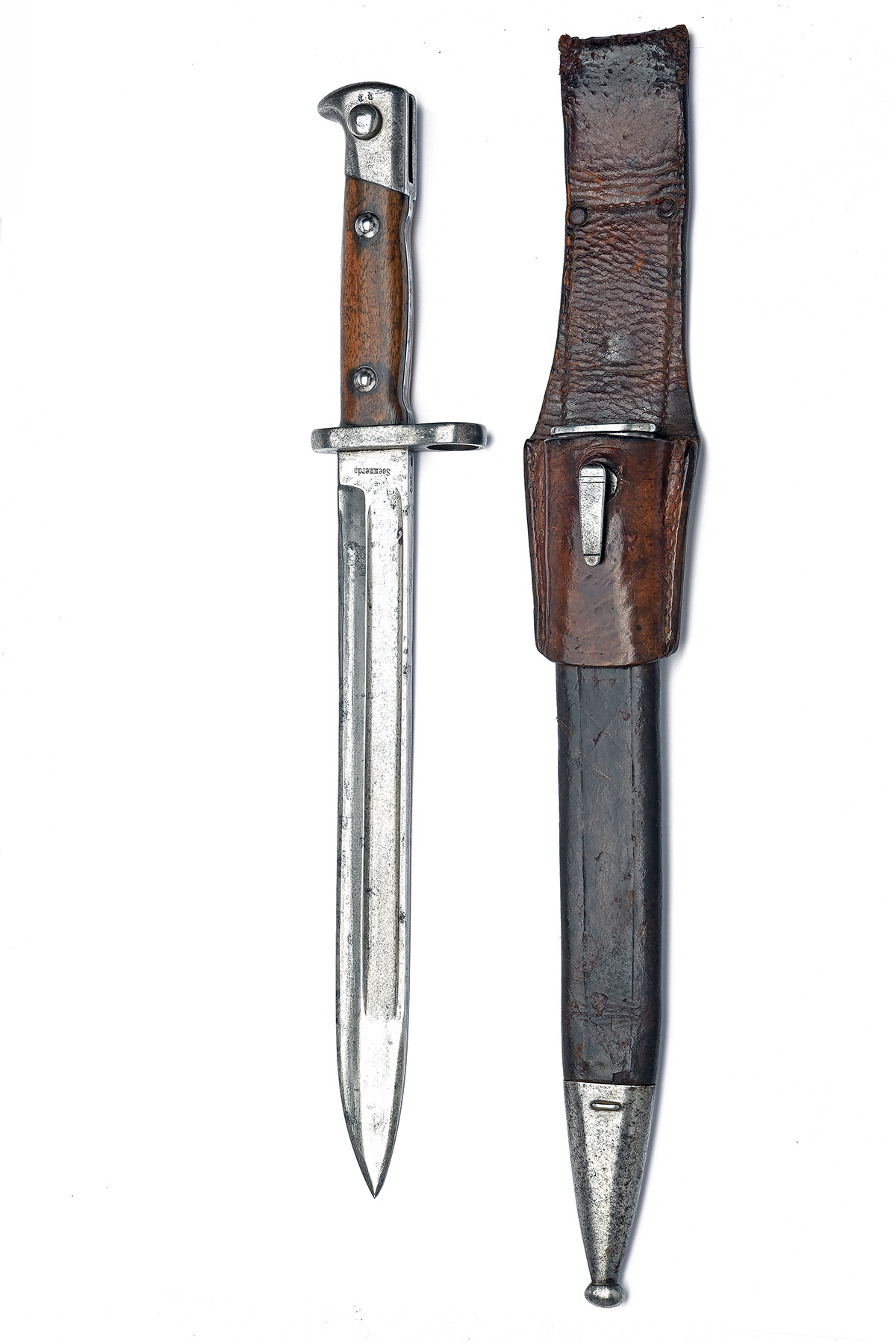 A GOOD GERMAN MODEL 1871/84 MAUSER BAYONET BY SOEMMERDA, dated 1887, with 10 in. single-edged blade fullered on each side, ricasso marked 'Soemmerda', blade back with crown over 'W / 87' plus inspection mark, cross-guard regimentally marked '94.R.11.42', riveted wooden grips, pommel with two further inspection marks, with its brown leather scabbard with steel fittings, the locket with matching regimental details, plus brown leather frog