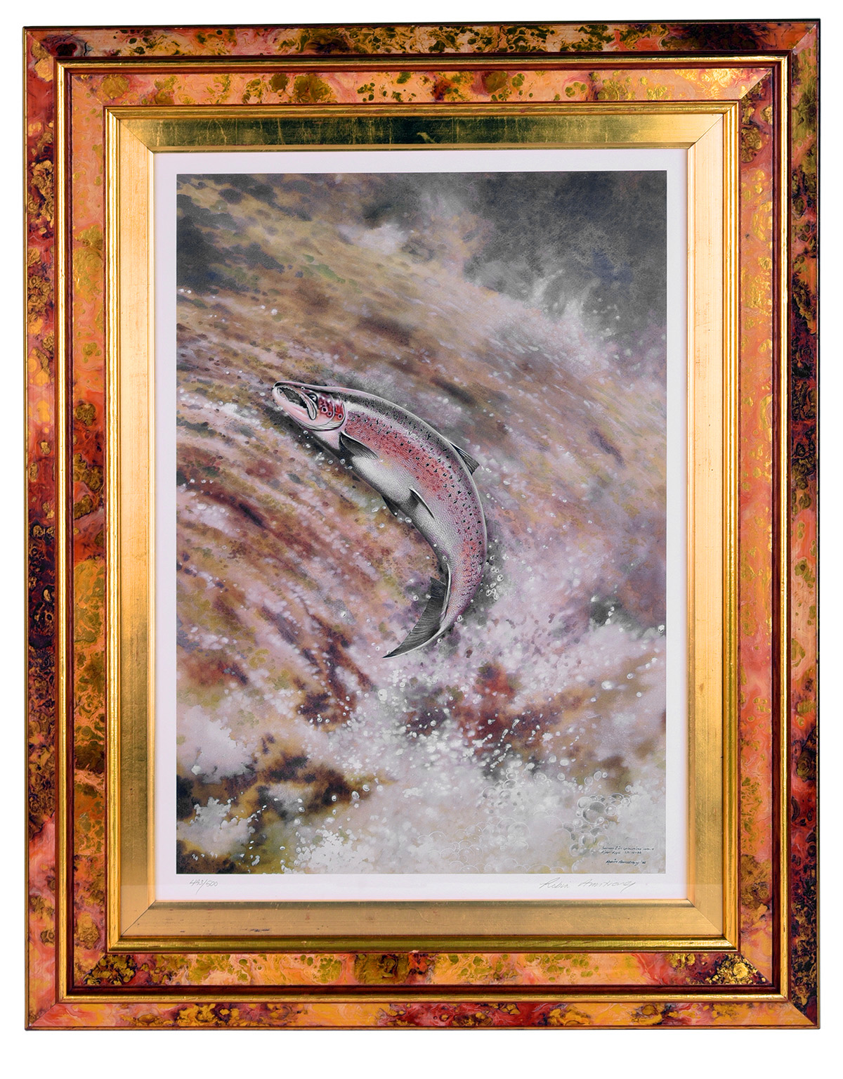 ROBIN ARMSTRONG (BRITISH CONTEMPORARY): 'SALMON IN SPAWNING COLOURS; RIVER LYD', a limited edition print (No. 493 / 500), in a marbled gilt effect frame (21in. x 27in.)