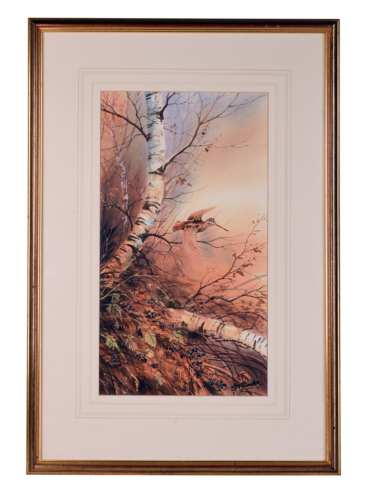 SIMON TRINDER (Contemporary): WOODCOCK IN SILVER BIRCH An original watercolour, signed by the artist, framed (18in. x 27in. inc. frame)