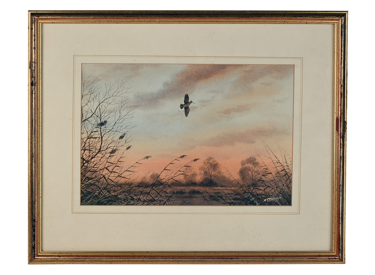 SIMON TRINDER (Contemporary):WOODCOCK FLIGHTING OVER THE MARSH