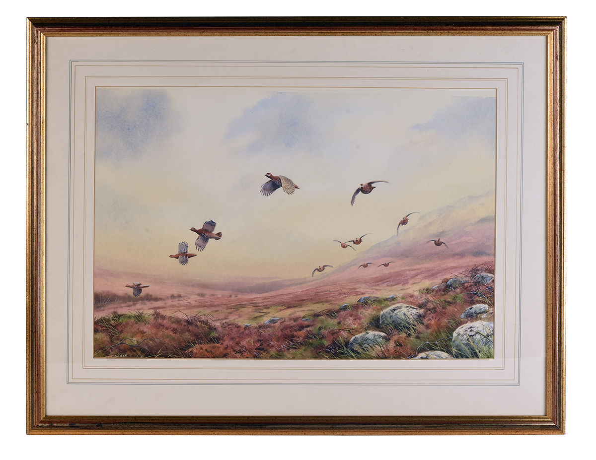 SIMON TRINDER (Contemporary): GROUSE OVER MOORLAND An original watercolour, signed by the artist, framed (27in. x 21in. inc. frame)