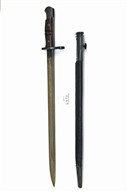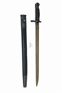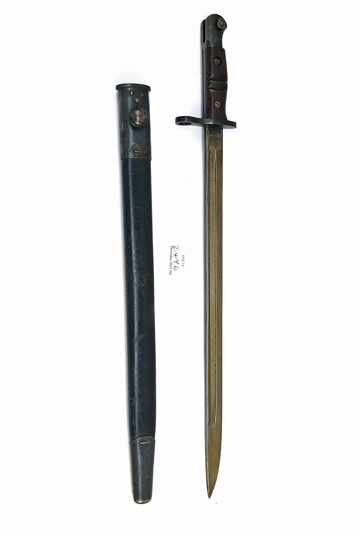 A WORLD WAR I PATTERN 1913 REMINGTON SWORD BAYONET, dated 1916, with 16 3/4 in. single-edged blade fullered on each side, ricasso with '1913 / 11 16 / REMINGTON' with Broad Arrow and inspection marks over, wooden grips, black leather scabbard with steel fittings
