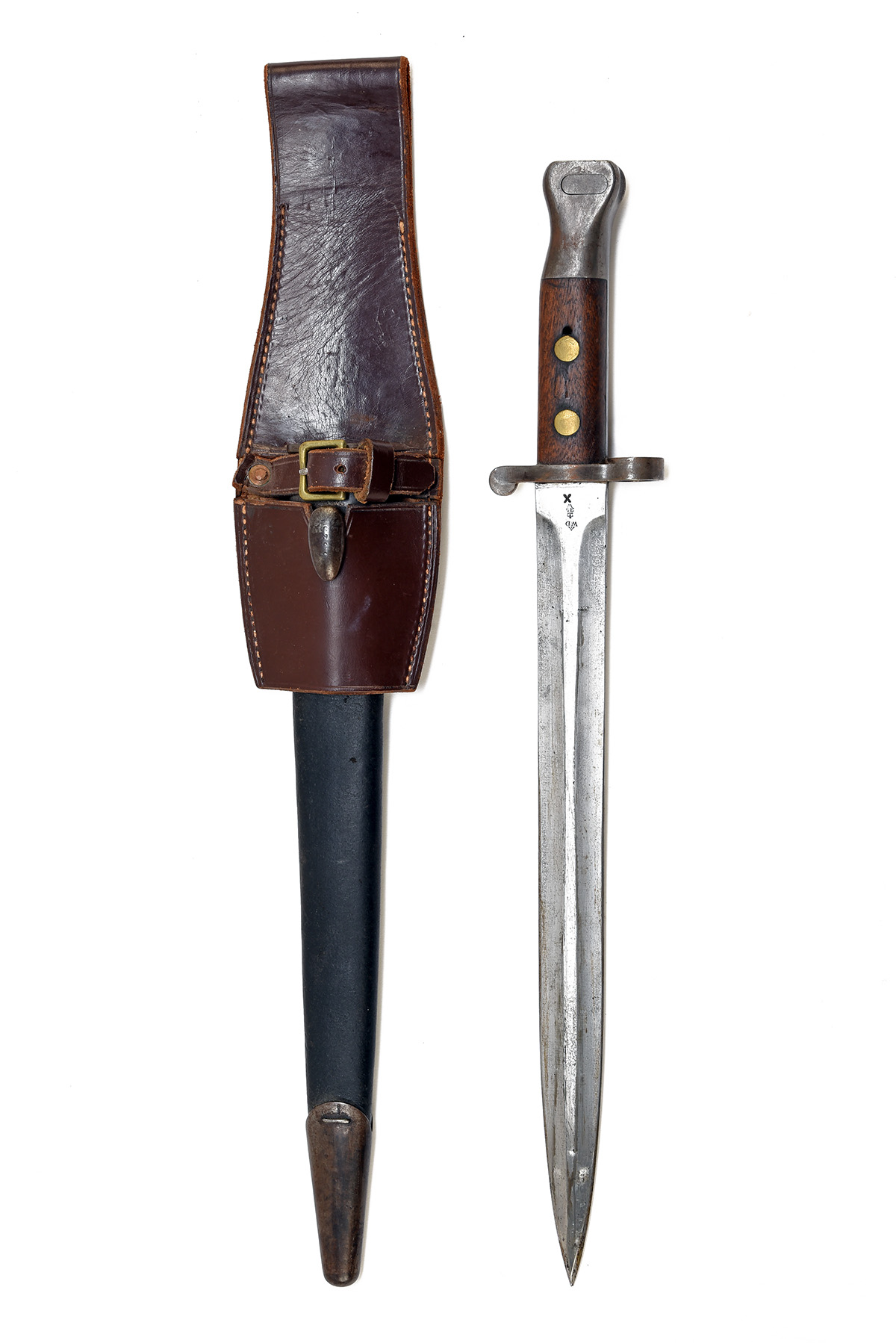 A PATTERN 1888 MARK 1 TYPE II SWORD BAYONET BY WILKINSON, dated 1892, with 12 in. double-edged blade, ricasso with crown over 'V R / 1 '92 / WILKINSON LONDON' with Broad Arrow, 'WD' Wilkinson inspection mark and bend test 'X' over, with its black leather scabbard with steel fittings and brown leather frog