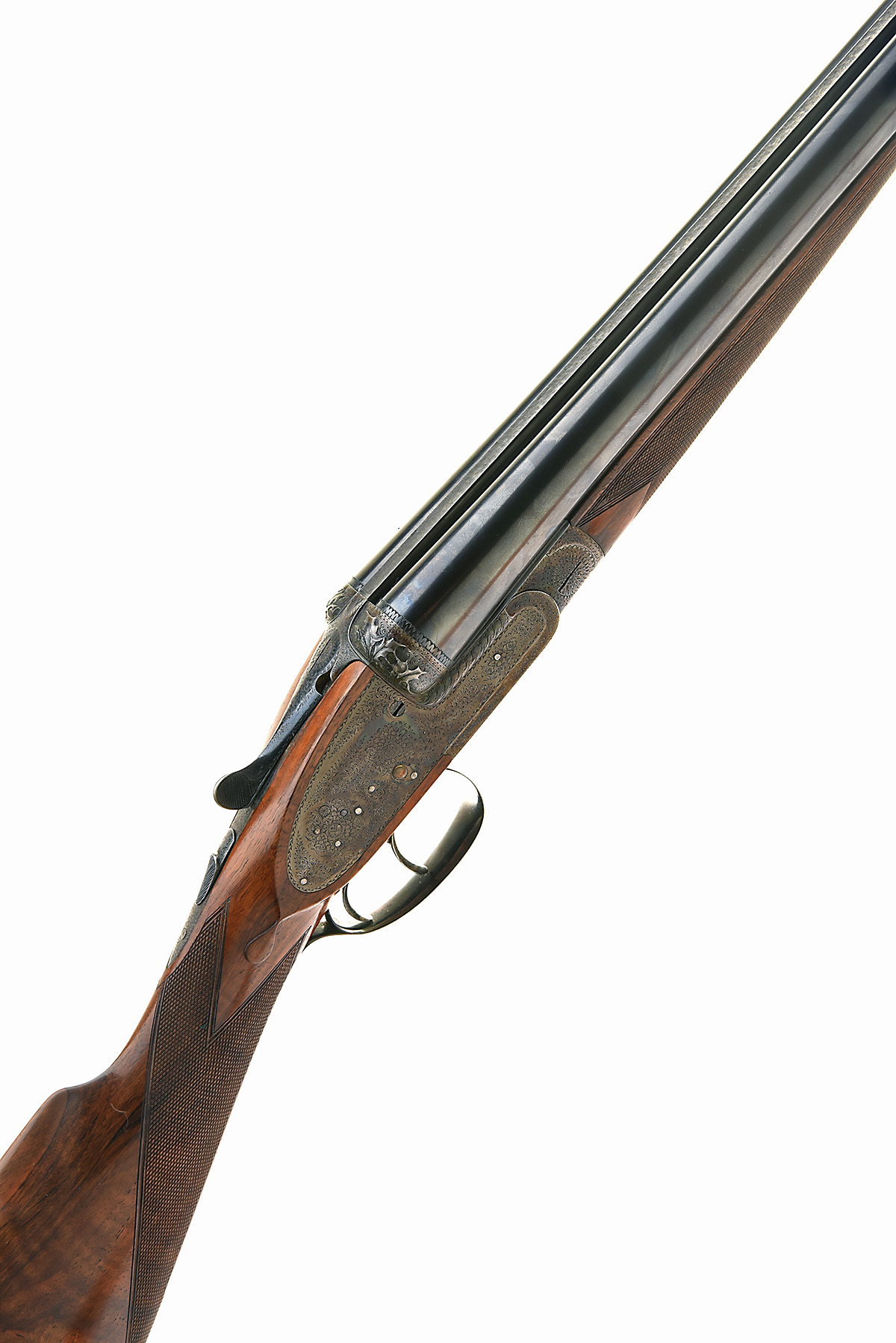 BELGIAN 12-BORE SIDELOCK EJECTOR, serial no. 8027, dated 1927, 27 1/2in. nitro barrels with matt rib, 2 3/4in. chambers, bored approx. 1/4 and 1/2 choke, bolstered treble-grip action with hidden third bite, fences carved with foliate motifs, manual safety with gold-inlaid 'S' detail, articulated front trigger, border and acanthus scroll engraving with floral bouquets, retaining some original colour-hardening and finish, 14in. stock including 5/8in. rubber recoil pad, weight 7lb. 3oz., in a tan leather 'Brady' guncase