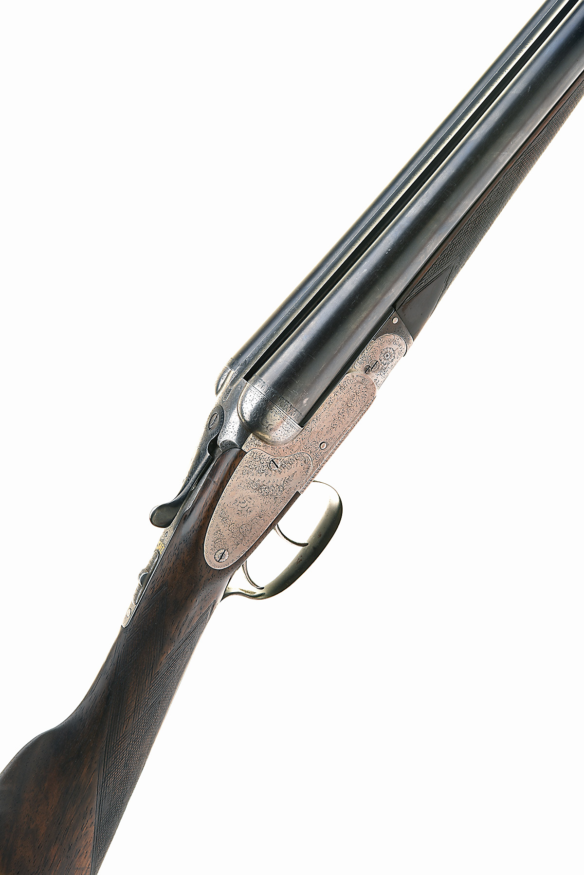 COGSWELL & HARRISON 12-BORE SIDEPLATED BOXLOCK EJECTOR, serial no. 34988, circa 1908, 26in. replacement nitro barrels (in 1934), rib engraved 'CHARLES HELLIS & SONS LTD. 121 & 123 EDGWARE ROAD. HYDE PARK. LONDON. W.', 2 1/2in. chambers, bored approx. 1/4 and full choke, treble-grip action, automatic safety with gold-inlaid 'SAFE' detail, border and acanthus scroll engraving with floral bouquets, the decorative 'strengthening plates engraved en suite, brushed finish, 14 1/2in. stock, weight 6lb. 5oz., in its brass-cornered leather case