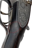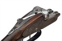 for 1910, 28in. nitro chopperlump barrels (loose on action), rib inscription rubbed, 2 1/2in. chambers, bored approx. true cyl. and imp. cyl. choke, bore dimensions marginal, removable striker discs, automatic safety with gold-inlaid 'SAFE' detail, cocking-indicators, best fine acanthus scroll engraving with floral bouquets, brushed finish, 14 3/4in. stock (worn and with cracks to head and hand, left overhorn springing), weight 6lb. 7oz.