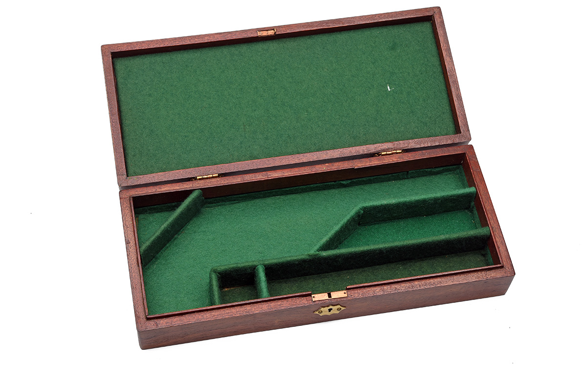 A WOODEN HANDGUN CASE FOR 'TRANTER' REVOLVER, approx. 13 3/4in. x 6in. x 2 1/2in. lined with green baize, brass lock, key included