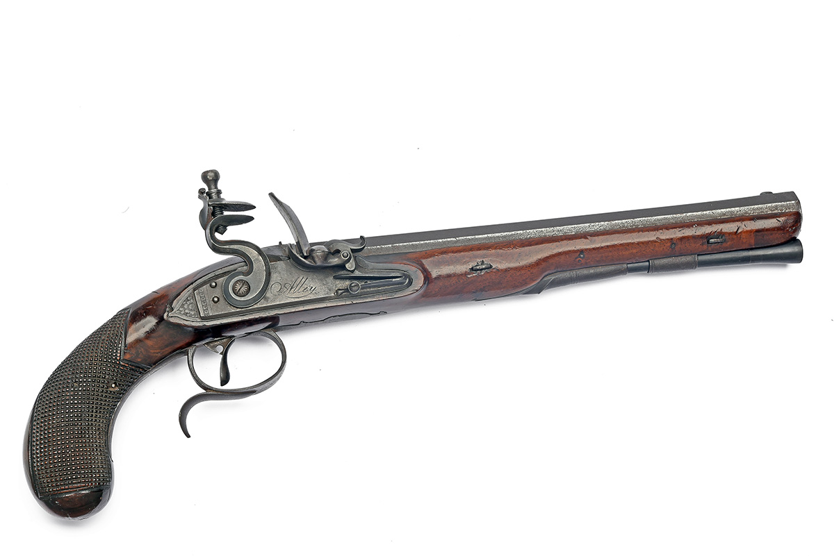 A 25-BORE FLINTLOCK DUELLING PISTOL SIGNED ALLEY (DUBLIN), no visible serial number,