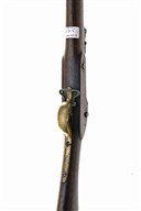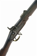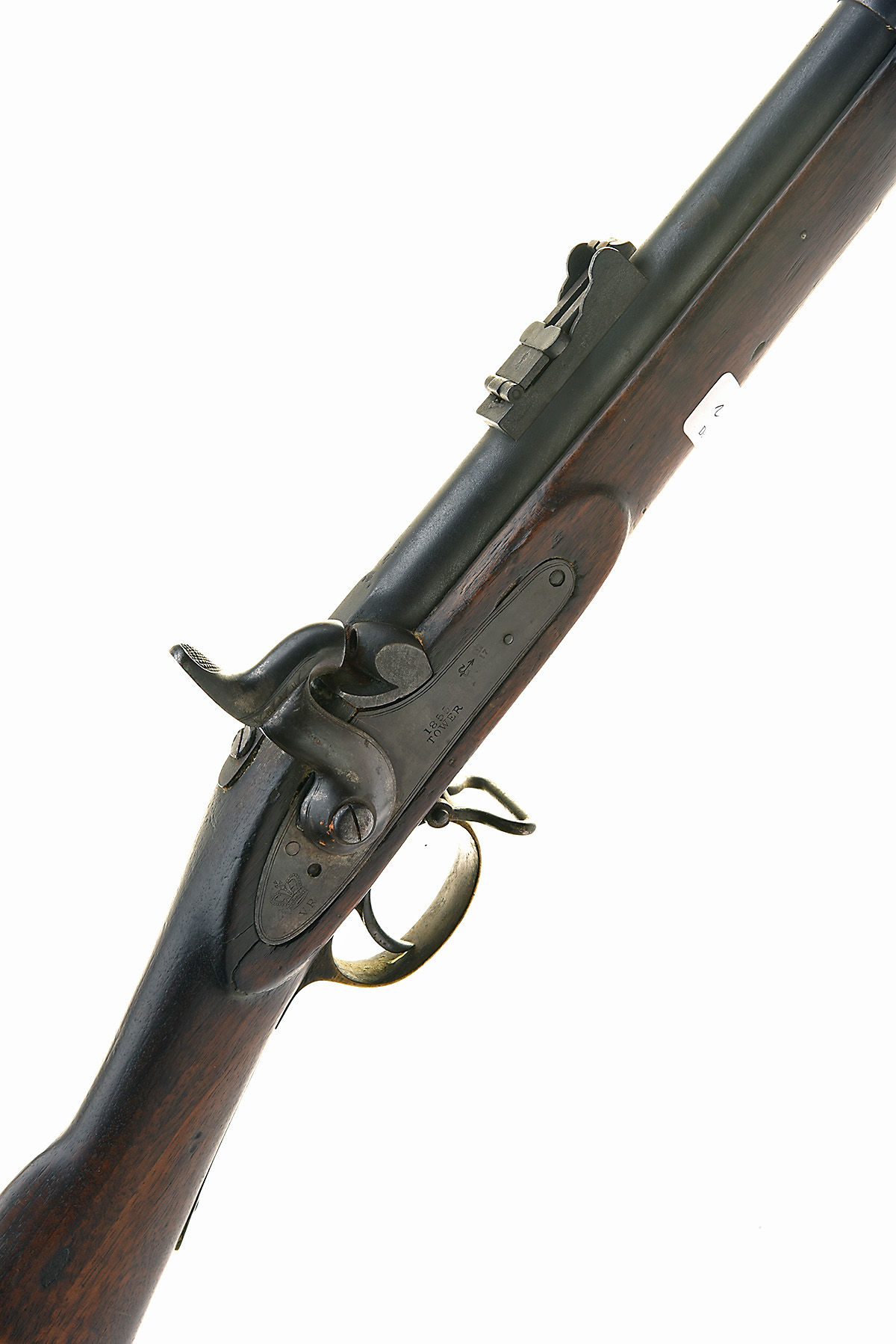 A .577 PERCUSSION PATTERN 1853 ENFIELD RIFLE-MUSKET SECOND TYPE SERVICE RIFLE, SIGNED TOWER, no visible serial number dated 1855, with 39 in. sighted barrel with Birmingham inspection marks, border-engraved lock with crown over 'V.R', lock-viewer's mark and '1855 / TOWER', full stocked, three spring-retained barrel-bands, complete with sling swivels and rammer, worn, stock cracked around the lock with chipped losses, butt with losses, some with large, crude, wooden inlays, trigger-guard tang broken through the screw-hole, some replaced screws