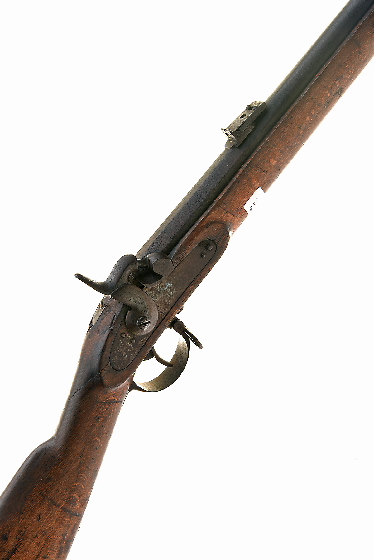 AN AUSTRIAN .60 PERCUSSION MODEL 1854 "LORENZ" RIFLE-MUSKET, UNSIGNED, no visible serial number, circa 1860, with 37 1/4 in. round to octagonal sighted barrel, plain lock, full stock with cheek rest, sprung barrel-bands, with sling swivels and rammer, worn, rusted and pitted, stock cracked and repaired at the wrist, no visible markings