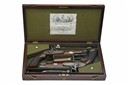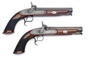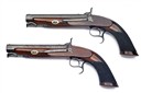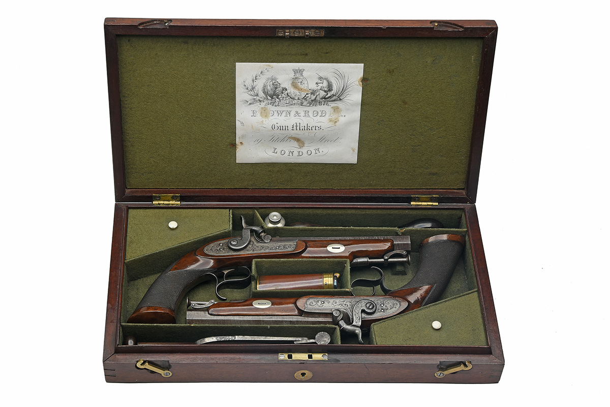 circa 1855, with octagonal 6 1/2in. sighted barrels, the top-flats signed 'BROWN & RODDA, TITCHBORNE ST, LONDON', colour hardened breech-blocks with moulded snails, engraved top-tangs, border and scroll engraved colour hardened bar-action locks signed 'BROWN & RODDA', engraved dolphin-headed hammers, walnut full-stocks with finely chequered swept grips, blued spurred trigger guards and captive iron rammers, strong traces of colour and finish to both and in their period mahogany storage-case, lined and compartmented in green baize, Brown & Rodda parchment trade label inside lid and complete with a good Dixon two-way flask, loading rod, scissors mould and other sundry tools and pots