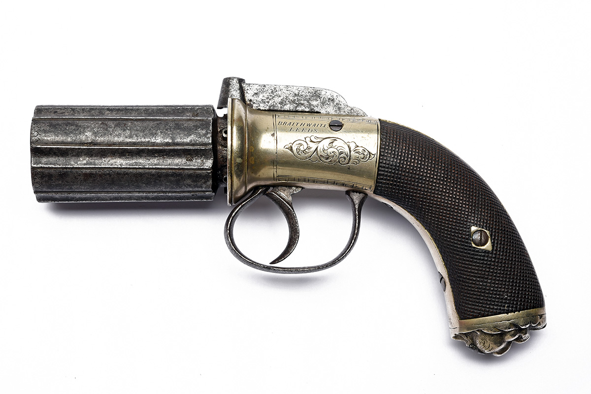 A 100-BORE PERCUSSION PEPPERBOX REVOLVER SIGNED BRAITHWAITE, LEEDS, no visible serial number,