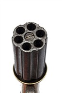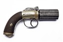 A 100-BORE PERCUSSION PEPPERBOX REVOLVER SIGNED BRAITHWAITE, LEEDS, no visible serial number, with 2 3/4in. six-shot barrel group (pitted), white metal rounded frame with central bar hammer and guarded trigger, finely chequered walnut grips and heavy cast lionshead pommel
