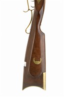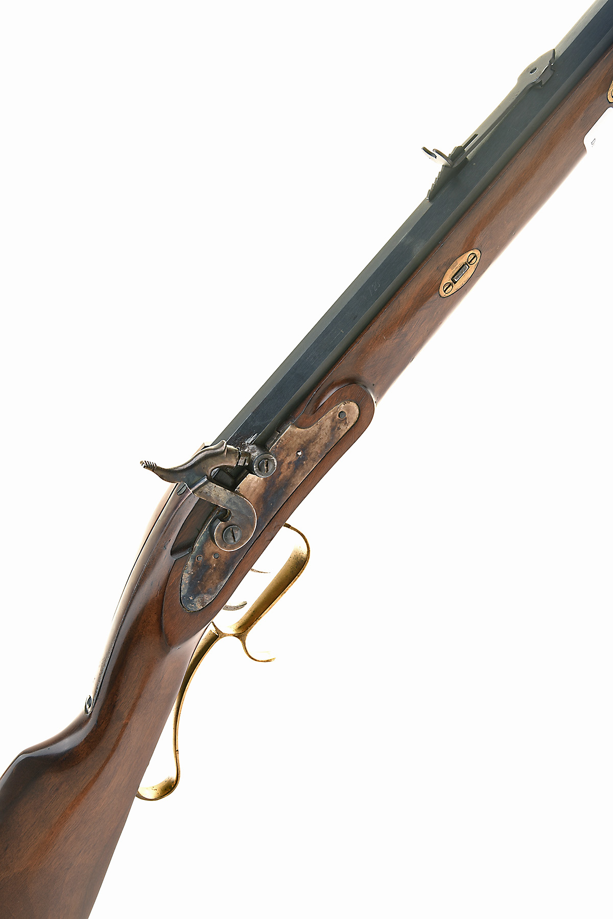 A CASED REPRODUCTION .451 PERCUSSION MATCH-RIFLE SIGNED ARDESA, MODEL 'HAWKEN MATCH', serial no. 14-13-012179-11, for 2011, with blued heavy octagonal 33in. barrel, tunnel fore-sight, buckhorn rear-sight and tang peep-sight, engraved colour-hardened lock, walnut half-stock and engraved brass furniture, brass butt plate, cheek