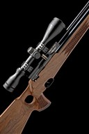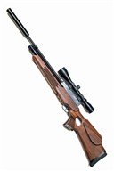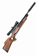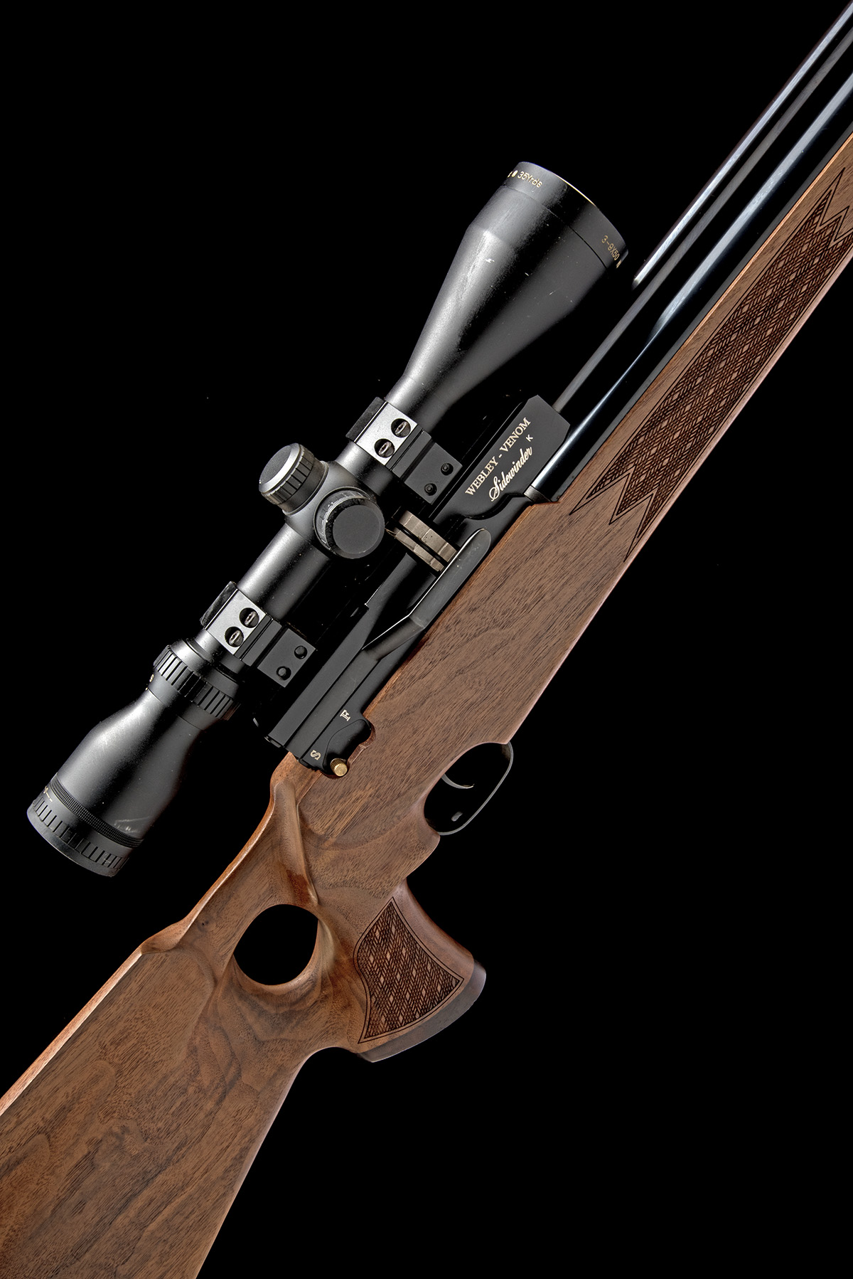 for 2009, with blued 24 1/4in. barrel including detachable sound moderator, blacked alloy receiver with side-lever operation, rotary magazine (spare included) and side safety, both sides of the breech-block marked 'WEBLEY - VENOM' over 'SIDEWINDER K', the serial number and working pressure marked to the left side rear, deluxe walnut thumbhole three-quarter stock with skip-chequered grip and fore-end, the heel of grip with contrasting wood cap marked 'WEBLEY', adjustable heel-pad, pressure gauge inlet into underside of fore-end and under-barrel air reservoir, fitted with an unsigned 3-9x50 telescopic sight, together with a filling probe and spare seals kit (untested)