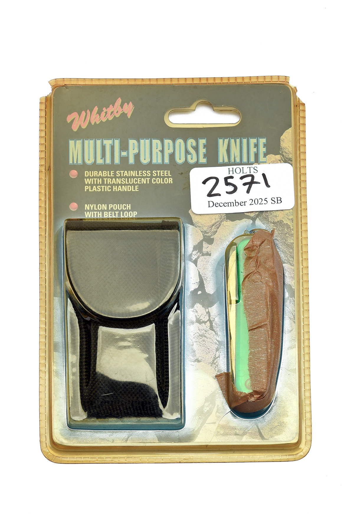 A UNUSED 'WHITBY' MULTI-TOOL, comprising of approx. 2in. drop point blade, saw, fish scaler, scissors, AWL, can and bottle opener, corkscrew, thread rope, file, philips screwdriver, nail cleaner, tweezers, toothpick, keyring and nylon carry case in original packaging