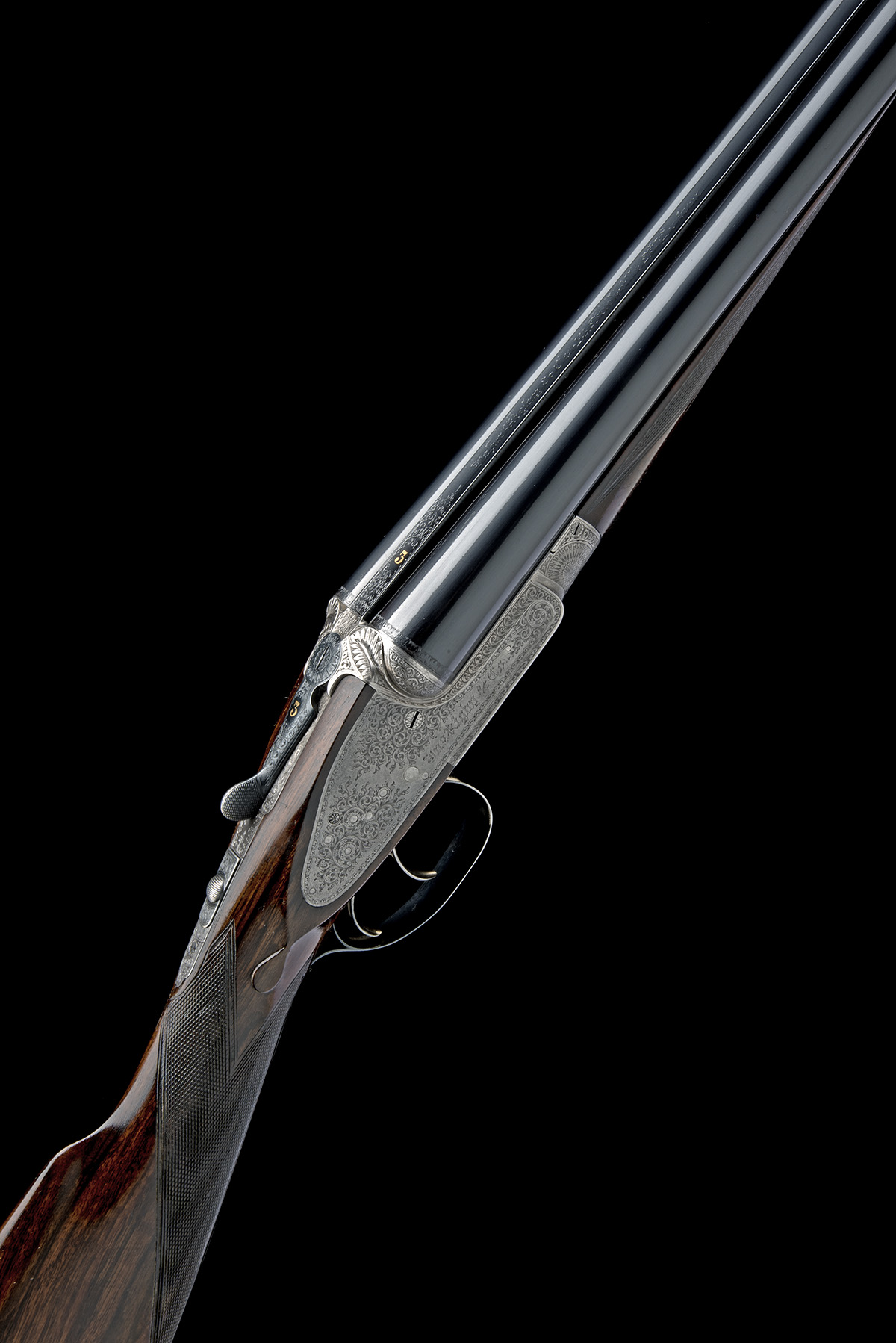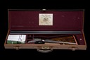 circa 1911, 30in. sleeved nitro barrels (in 2010), retaining original broad rib engraved 'John Rigby & Co. 43 Sackville St. London' in gothic script, the breech end with bold scroll engraving and gold-inlaid '3', 2 3/4in. chambers, bored approx. imp. cyl. and 1/4 choke, carved leaf fences, toplever gold-inlaid '3', automatic safety with gold-inlaid 'SAFE' detail, dipped-edge lockplates, best bold border and acanthus scroll engraving, brushed bright and reblued finish overall, 14 7/8in. well-figured stock (likely replacement) including 5/8in. recoil pad, weight 7lb., in a lightweight leather case