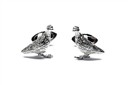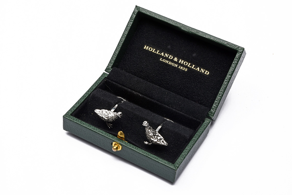 A SET OF RHODIUM GROUSE CUFFLINKS, set in a Holland & Holland green velvet lined case