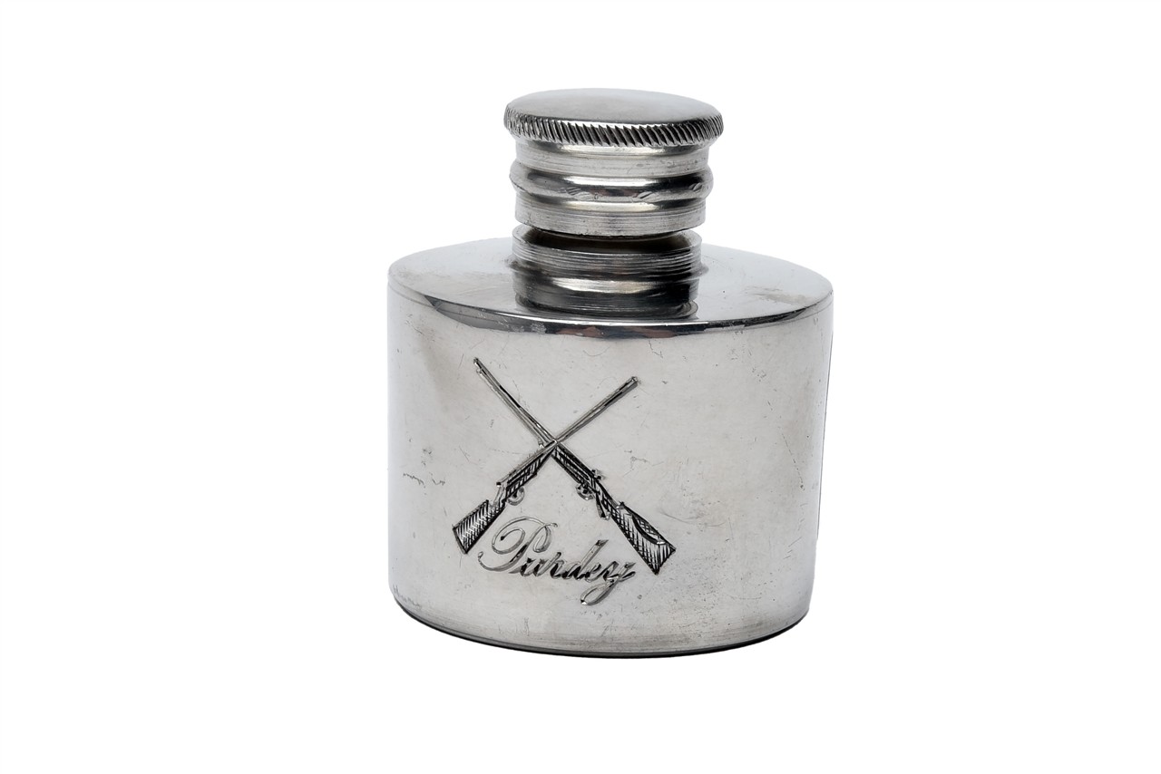 A 'PURDEY' GUNCASE OIL BOTTLE, approx. 40mm diameter, with crossed guns