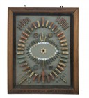 consisting of a comprehensive oval display of brass and paper shot cartridges, together with a display of brass bullet casings, wads and primers, mounted in a vintage glazed wooden frame with 'Imperial Chemical Industries Ltd' etched in gold and embossed with 'ELEY & KYNOCH AMMUNITION', measuring approx. 31in. x 25 1/4in.