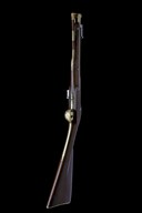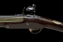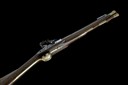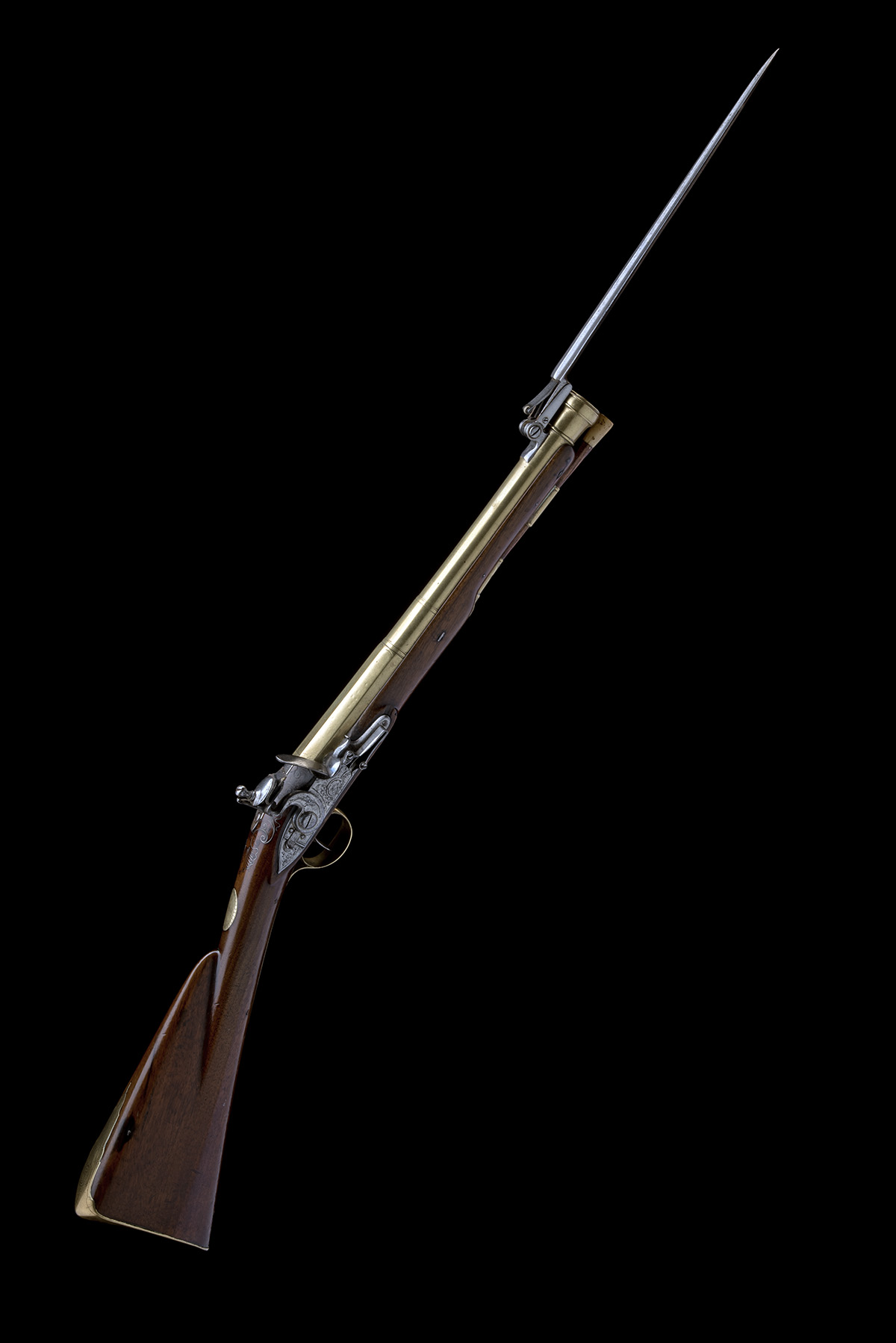 circa 1780, with 14in. triple-staged banded cannon barrel, triangular cross-section bayonet released by a catch at the tang to top of barrel and concealing the script signature 'LONDON', flat bevel edged lock with scroll engraving (rubbed) and stepped tail, the inside of lock with 'NOCK LONDON' signature (possibly spurious), walnut hand-rail full-stock with wire scroll inlays forming an apron around the top-tang, brass furniture including acorn finial and bone-tipped wood ramrod