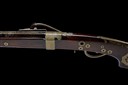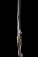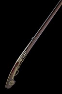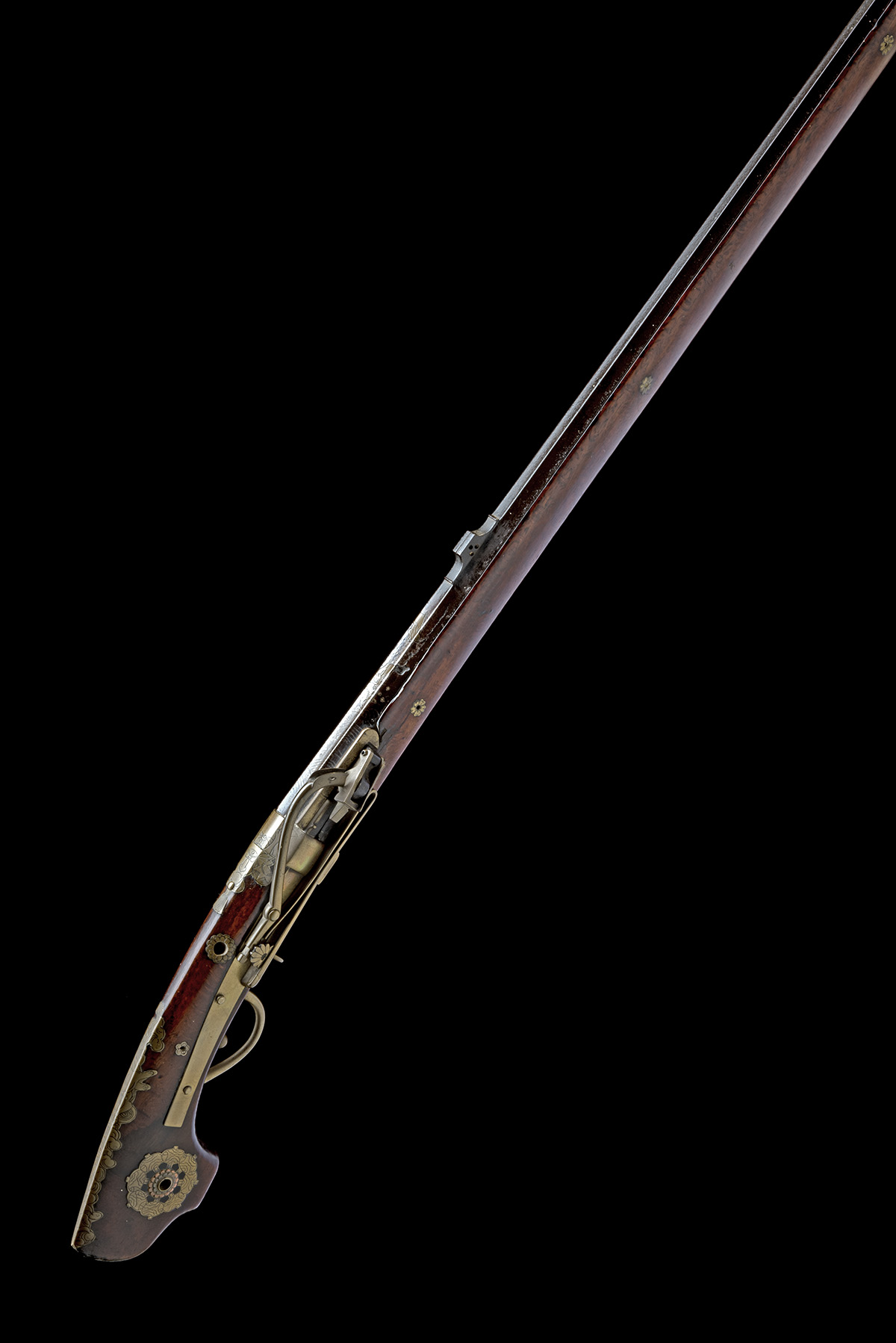 circa 1865, with octagonal 39 1/2in. barrel, offset vase muzzle with applied brass detailing, ramp and blade fore-sight, block rear-sight, the breech area with applied bolting rabbit motifs, side-mounted pan at breech with brass flash-guard and hinged rainproof cover, brass lockplate of typical form with brass serpentine and exposed mainspring with chrysanthemum mount, fruitwood full-stock of typical form inlet with engraved brass chrysanthemum devices, rolling clouds and a 'mon' at heel (unidentified), guarded button trigger, ramrod absent