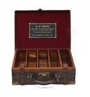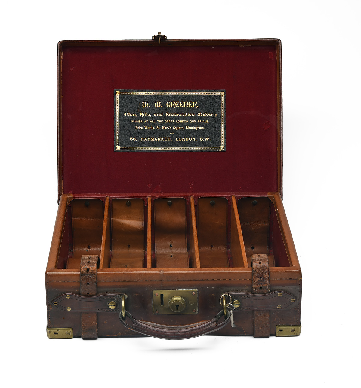for approx. 250 cartridges, the lid interior lined with red baize, a leather gold-tooled W.W. Greener trade label, four oak dividers, five leather lifters, brass lock (including key), the lid exterior with the initials 'E.M.C.I.' (Ernest Martyn Critchley Instone 1872-1932)