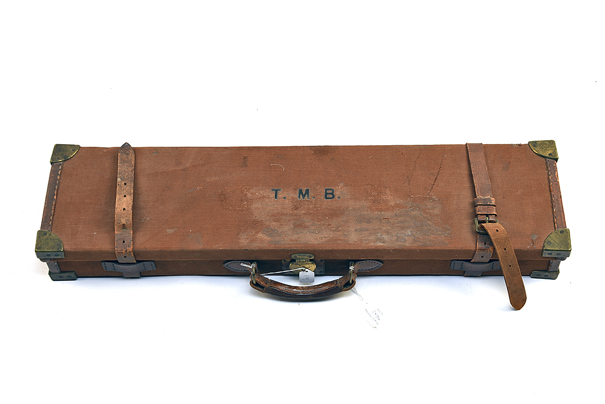 A WESTLEY RICHARDS BRASS-CORNERED CANVAS AND LEATHER SINGLE GUNCASE, fitted for 28in. single barrel, the interior lined with green baize, a Westley Richards & Co. trade label, brass lock (key missing)the lid exterior marked 'T.M.B.'