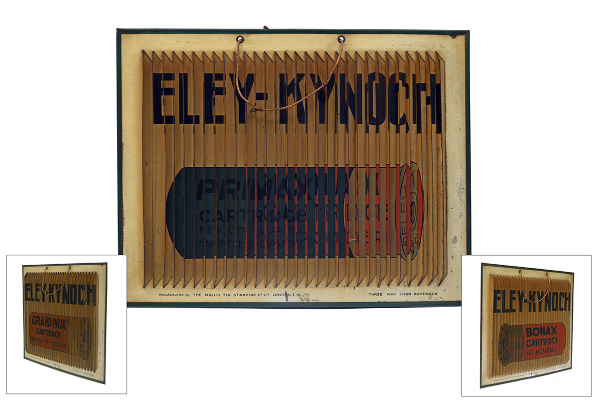 pre-war and measuring 14in. x 11in., the predominantly buff-coloured sign with raised flanges changing the viewed image from a 'Bonax' cartridge when viewed from the left to a 'Primax' when viewed from the front and a 'Grand Prix' when viewed from the right, the lower margin signed 'MANUFACTURED BY THE WALLIS TIN STAMPING CO. LTD. LONDON E15' and 'THREE WAY SIGNS PATENTED'