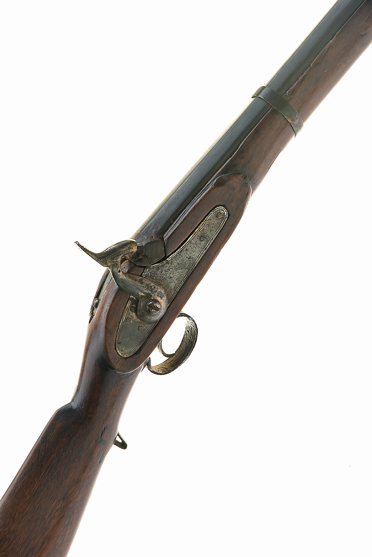 A .800 PERCUSSION SCRATCH-BUILT SMOOTHBORE MUSKET, UNSIGNED, no visible serial number, crudely constructed from poor quality circa 1840s parts and a few modern scratch pieces, with 33 1/2 in. sighted barrel, plain border-engraved lock, heavily worn throughout, hammer constructed from two broken parts, stock cracked, with much glue and filler in evidence, probably a north African tourist piece
